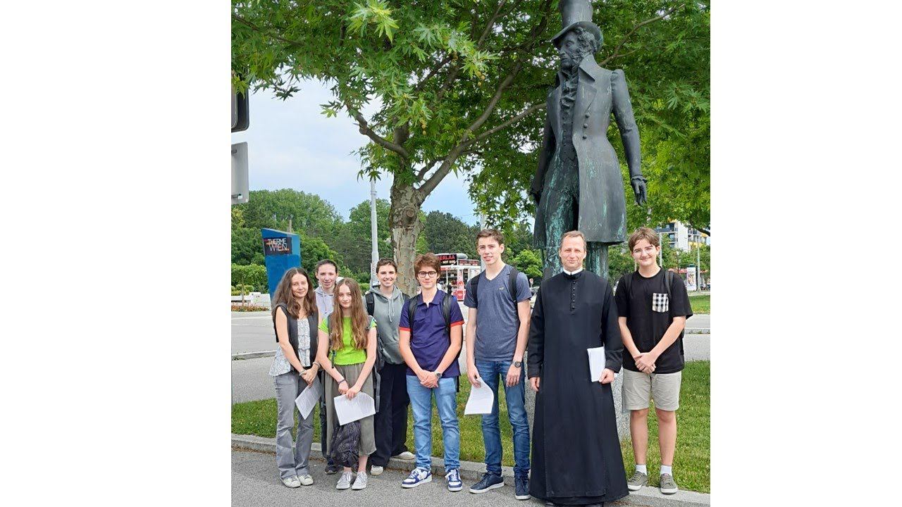 По поводу празднования 225-ого дня рождения А.С. Пушкина школьники читают стихи поэта и поют песни. Руководитель Австрийской ассоциации русского языка и литературы рассказывает о преподавании русского языка в австрийских школах.