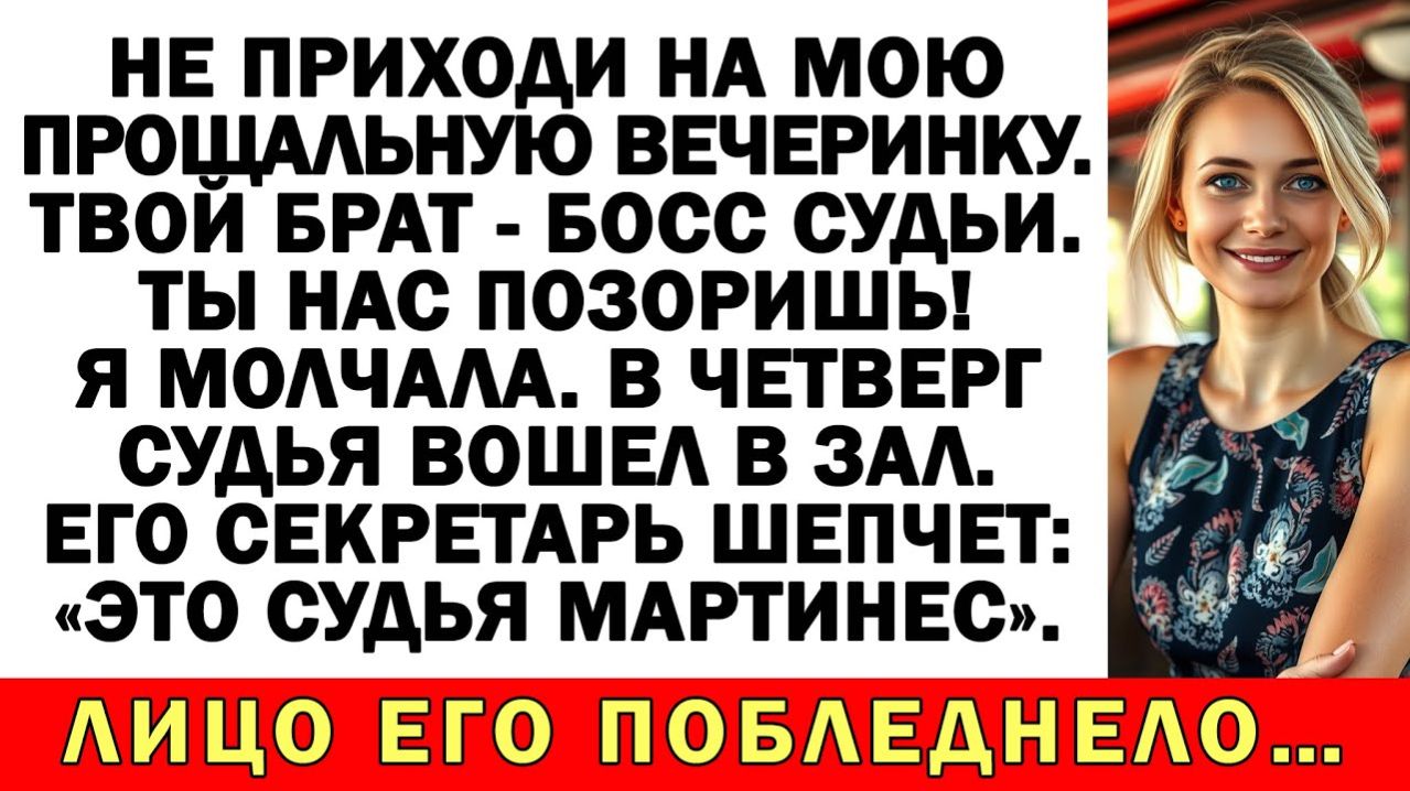 Не приходи на мою прощальную вечеринку. Твой брат — босс судьи. Ты нас позоришь! Я молчала. В четверг судья вошел в зал. Его секретарь шепчет: «Это судья Мартинес». Лицо его побледнело… Подборка историй из жизни с неожиданной концовкой: Истории из жизни| После развода муж ушёл. А его мама пришла… с багажом и без спроса. |Аудио рассказы - https://rutube.ru/video/4d565ef2db53df57c3a3570f94dd3361/ Свекровь учила меня семейной жизни… Муж поддакивал! Теперь живет у нее на раскладушке! - https://rutube.ru/video/a45ba8d386322b28a3b1acd16bc8c7a8/ Истории из жизни| Свекровь всполошилась |Аудио рассказы |Жизненные истории - https://rutube.ru/video/9b97e109cbd537dde3996440fc992e7c/ Муж решил вписать в мою квартиру свою маму после развода — но его ждала повестка! - https://rutube.ru/video/1a71e51ffddb89c1c7683bc2cdd1b621/ Истории из жизни| Родные решили, что все бесплатно, а я вложила 8500$ - https://rutube.ru/video/4b188c114d0fd7d51a6f1d515caf3a80/ Если любите сильные аудиорассказы и истории из жизни — этот рассказ вас не отпустит до финала. Здесь оживают настоящие семейные истории – драматичные, забавные, порой неожиданные, но всегда жизненные. Свекрови и невестки, тёщи и зятья, братья и сёстры – у каждого своя правда, свои эмоции и свои скандалы. Узнаваемые ситуации, острые конфликты и неожиданные развязки ждут тебя в каждом новом видео! Подпишитесь и напишите, как бы вы поступили на месте главных героев. Жизнь пишется без сценария, но каждая история оставляет след... #аудиорассказ #историяизжизни #жизненныеистории #семейнаядрама #предательство Аудиорассказ, аудиорассказы, история из жизни, истории из жизни, жизненная история, жизненные истории, семейная драма, про свекровь, про измену, про предательство, сильная история, рассказ до слёз, с неожиданной развязкой