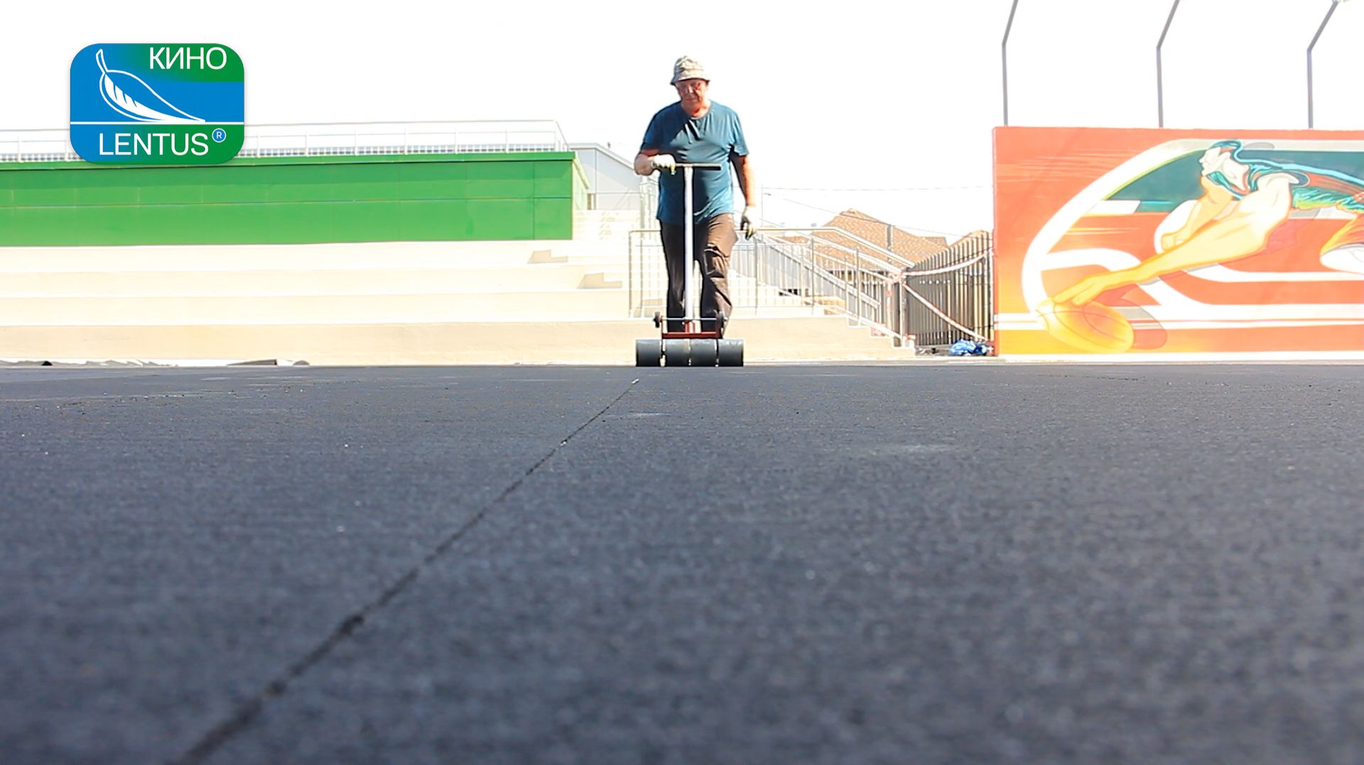 Очередной этап создания спортивной площадки с покрытием LENTUS PLAY SOFT. На подготовленное и высохшее основание наносим двухкомпонентный полиуретановый клей и приклеиваем резиновую подложку Regupol. С помощью специального шпателя равномерно наносим клей и раскатываем резиновое покрытие так, чтобы на стыках не было щелей и под покрытием не оставались пузыри. Обязательно равномерно прокатываем утяжелителем по всей поверхности. Излишки резины легко отрезаются канцелярским ножом