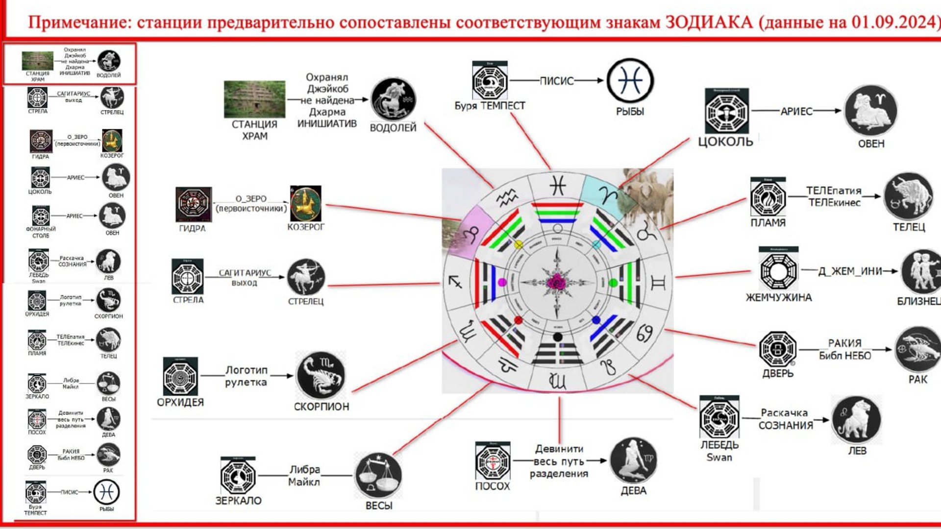 Схема соответствия станций Дхармы Инициативы знакам Зодиака