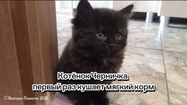 Котёнок Черничка впервые кушает мягкий корм