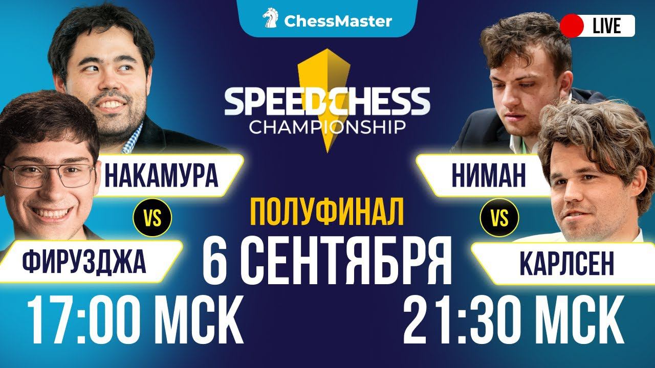 https://school.chessmaestro.ru/111-endgame - 111 эндшпилей от Гоганова и месяц в клубе в подарок! https://school.chessmaestro.ru/taktika-goganov - 30 тактических приемов от гроссмейстера Гоганова и месяц в клубе в подарок! Годовой курс «Школа победителей» ждёт тех, кто хочет рост рейтинга и 1-й разряд — https://school.chessmaestro.ru/winners ♔ Транслируем матчи полуфинала SpeedChess 2024 вместе с GM Фаррухом Амонатовым Время начала матчей: Фирузджа - Накамура — 17:00 МСК Карлсен - Ниманн — 21:30 МСК Комментируют: GM Фаррух Амонатов и FM Максим Омариев Донат – https://www.donationalerts.com/r/chessmaster Оперативные новости в нашем телеграм – https://t.me/ChessMaestro Обучение шахматам с кайфом – https://school.chessmaestro.ru Подписаться на канал – https://goo.gl/nY2kmn ♕ Получите книгу «21 критическая ошибка в шахматах» бесплатно – http://chessmaestro.ru/21mistakeyoutube Наши проекты – https://taplink.cc/chessmaster #ChessMaster #шахматы