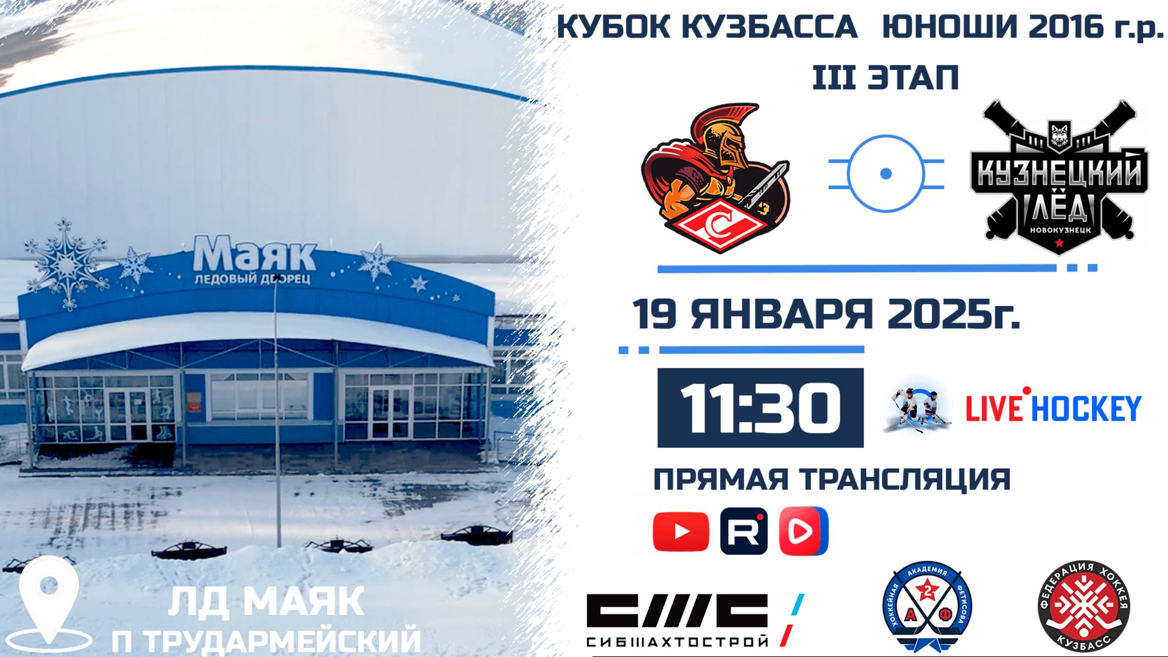 ПРЯМАЯ ТРАНСЛЯЦИЯ МАТЧА 19.01.2025г. в 11:30 СПАРТАК (Белово) VS КУЗНЕЦКИЙ ЛЕД (Новокузнецк) КУБОК КУЗБАССА СРЕДИ ЮНОШЕЙ 2016 г.р. ССЫЛКИ НА МАТЧИ: https://bit.ly/TYTCLICK СТАДИОН: ЛД МАЯК КОММЕНТАТОРЫ: ТРАНСЛЯЦИЯ НА YOUTUBE: https://youtube.com/live/GW8UXwBPISg?feature=share