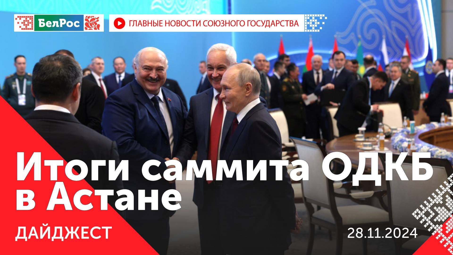 *Главное на 28 ноября 21:00* Закадровый текст озвучивает *ИИ Кирилл* - Президенты России и Казахстана провели переговоры в расширенном составе. - В столице Казахстана стартовал саммит государств-членов ОДКБ. - Главы стран ОДКБ подписали 14 документов по итогам саммита в Астане. - Александр Лукашенко принял участие в саммите государств-членов ОДКБ. - Премии в области науки и техники российским ученым вручили в Москве. - Совет Федерации одобрил закон о федеральном бюджете на 2025-2027 годы. - В России запустят спецпроект "Правда о Великой войне. Преступные замыслы Третьего рейха". - В Минске открылась выставка "Союзная крепость". - Республиканская акция "Марафон единства" расширяет масштаб. - Эмир Кустурица заявил о планах получить гражданство России. - Участок федеральной трассы "Новороссия" открыли в ДНР после капитального ремонта. - В Минске прошёл семинар по работе с обращениями граждан. - Жителя ДНР задержали за поджоги по заданию украинских спецслужб. Смотрите главные новости Союзного государства на телеканале БелРос. Ссылки на наши соц. сети Сайт: http://belros.tv/ Telegram: https://t.me/belrostv Одноклассники: https://ok.ru/group/55657426976918 ВКонтакте: https://vk.com/belrostv TikTok: https://www.tiktok.com/@belros_tv?_t=... RuTube: https://rutube.ru/channel/23501830/ Яндекс. Дзен: https://zen.yandex.ru/belrostvv Наши подкасты на Яндекс. Музыке: https://music.yandex.ru/album/25615251 #СоюзноеГосударство #главныеновости #новостисегодня