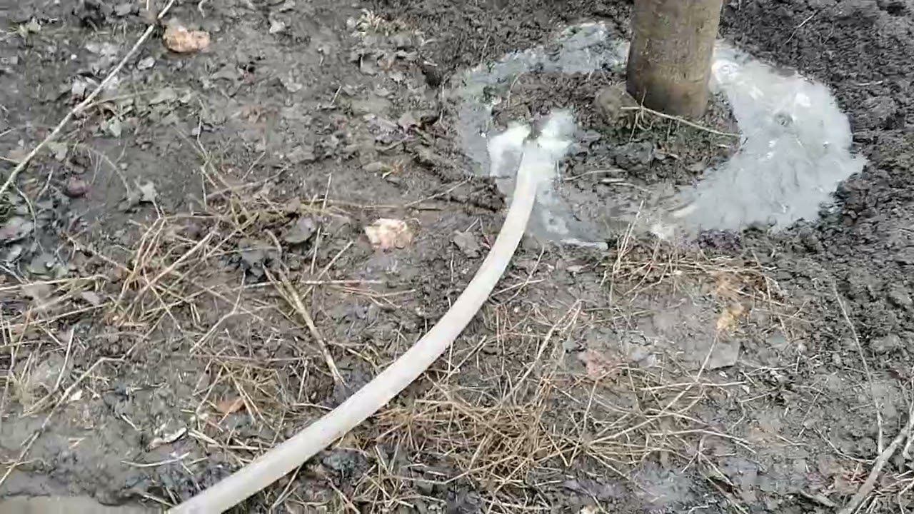Из-за дождливых дней в погребе поднялась вода, а там находится картошка, поэтому надо выкачивать воду из погреба. Я зря не выливаю воду на улицу, даю весеннюю подкормку нашим яблоням.