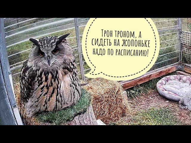 Сова филин Ёль оценивает свой новый трон из соломы. Что это такое жмякательное и расчепушительное?