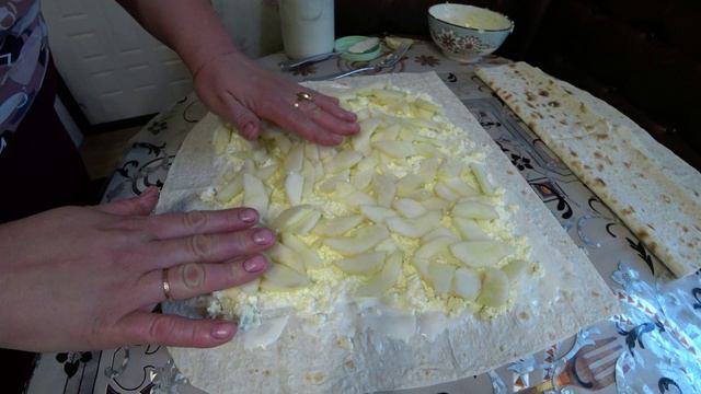 Рецепт: - яблоки - лаваш - 200 г творога - 1 яйцо - 4 ч. л. сахара - сметана.