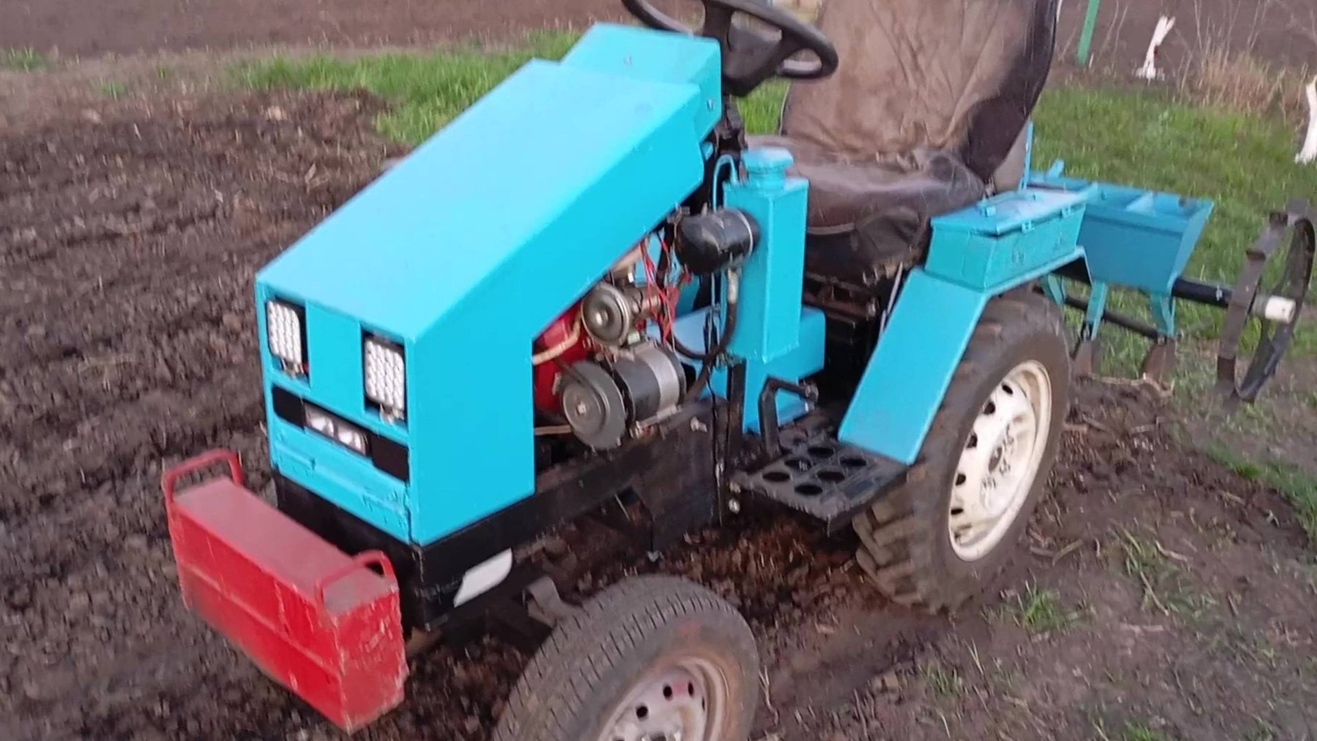 Минитрактор классика с зерновой минисеялкой сеет.