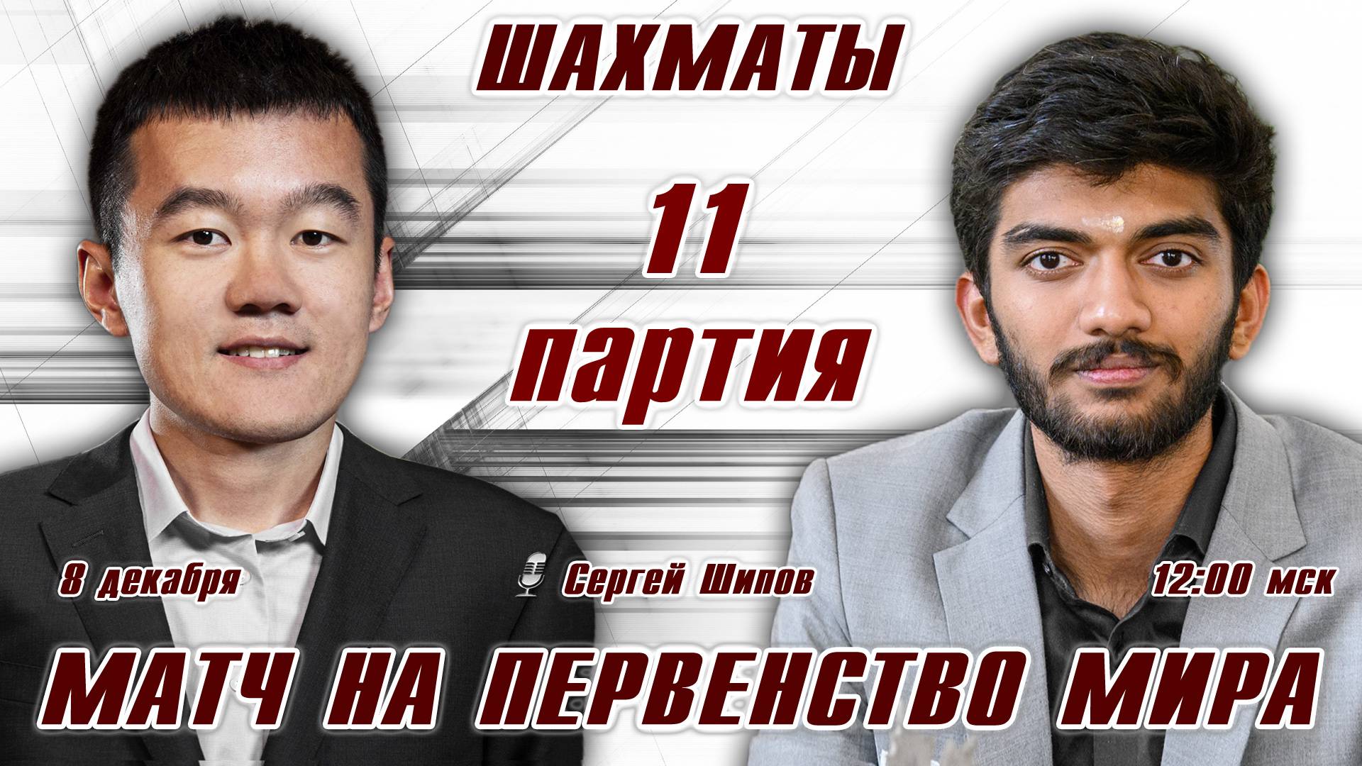 Матч на первенство мира! 11 партия 🏆 Дин Лижэнь - Гукеш ⏰ 8 декабря, 12.00 🎤 Сергей Шипов ♛ Шахмат