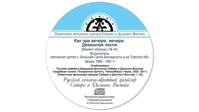 Как при вечере, вечере. Девишная песня [вариант образца к № 44]. Исполнитель: певческая группа с. Большая Галка Бакчарского района Томской области. Запись 1984 – 1991 гг. Опубликовано: Русский семейно-обрядовый фольклор Сибири и Дальнего Востока. Свадебная поэзия. Похоронная причеть. Новосибирск: Наука, 2002. 551 с. (Памятники фольклора народов Сибири и Дальнего Востока; т. 22)