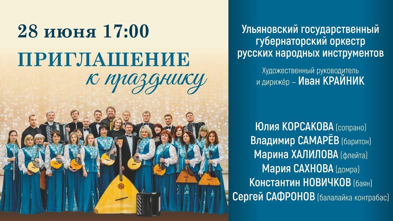 Ульяновский государственный губернаторский оркестр русских народных инструментов Художественный руководитель и дирижёр - Иван Крайник Солисты: Лауреат международного конкурса Юлия Корсакова (сопрано) Заслуженный работник культуры Ульяновской области Владимир Самарёв (баритон) Лауреаты международных и всероссийских конкурсов Марина Халилова (флейта) Мария Сахнова (домра) Константин Новичков (баян) Сергей Сафронов (балалайка контрабас) Концерт ведет Элла Якубенкова.