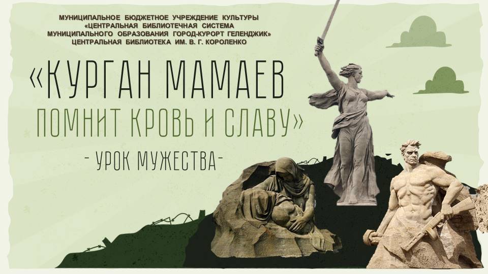 Центральная библиотека им. В.Г. Короленко представила юным читателям тематическую видео-выставку «Курган Мамаев помнит кровь и славу», приуроченную к 80-летию Победы в Великой Отечественной войне. Важной частью выставки стал рассказ об истории этого места и его роли при битве за Сталинград – одном из самых важных сражений всей Второй мировой войны. Фотохроника военных лет запечатлела пейзажи Мамаева кургана. Представляет интерес рассказ об устройстве парка и его монументах. Ведь помимо памятника «Родина-мать зовёт» на территории историко-мемориального комплекса расположены композиция-горельеф «Память поколений», аллея пирамидальных тополей, площадь Стоявших насмерть, стены-руины, площадь Героев, монументальный рельеф, зал Воинской славы, площадь Скорби и воинское мемориальное кладбище. Все эти части неразрывно связаны друг с другом и идеей памяти павших, заложенной под руководством известного советского скульптора Е. В. Вучетича. В видео-сюжете представлены книги, которые рассказывают юным читателям о страшных событиях Сталинградской битвы. Одна из них - «Дети Ивана Соколова» автора В. Шмерлинга. В ней повествуется о том, как Гене Соколову, маленькому 8-летнему сталинградцу, наравне со всеми пришлось пережить немыслимые испытания и потерять всех близких в ужасных событиях Великой Отечественной войны. #ЧитающийГеленджик, #БиблиотекиГеленджика