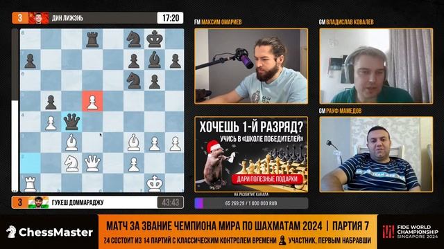 Годовой курс «Школа победителей» ждёт тех, кто хочет рост рейтинга и 1-й разряд — https://bit.ly/winners-wc2024 ♔ Трансляция важнейшего события в мире шахмат - матча за звание чемпиона мира Дин - Гукеш ⏱ Начало трансляций в 12:00 МСК Игровые дни: 25-27, 29-30 ноября. 1, 3-5, 7-9, 11-12 декабря. Тай-брейк: 13 декабря. Выходные – 28 ноября. 2, 6 и 10 декабря Призовой фонд – 2,5 миллиона долларов Комментируют: GM Рауф Мамедов и GM Владислав Ковалёв, а так же мастер FIDE Максим Омариев Донат – https://www.donationalerts.com/r/chessmaster Оперативные новости в нашем телеграм – https://t.me/ChessMaestro Обучение шахматам с кайфом – https://school.chessmaestro.ru Подписаться на канал – https://goo.gl/nY2kmn ♕ Получите книгу «21 критическая ошибка в шахматах» бесплатно – http://chessmaestro.ru/21mistakeyoutube Наши проекты – https://taplink.cc/chessmaster #ChessMaster #шахматы