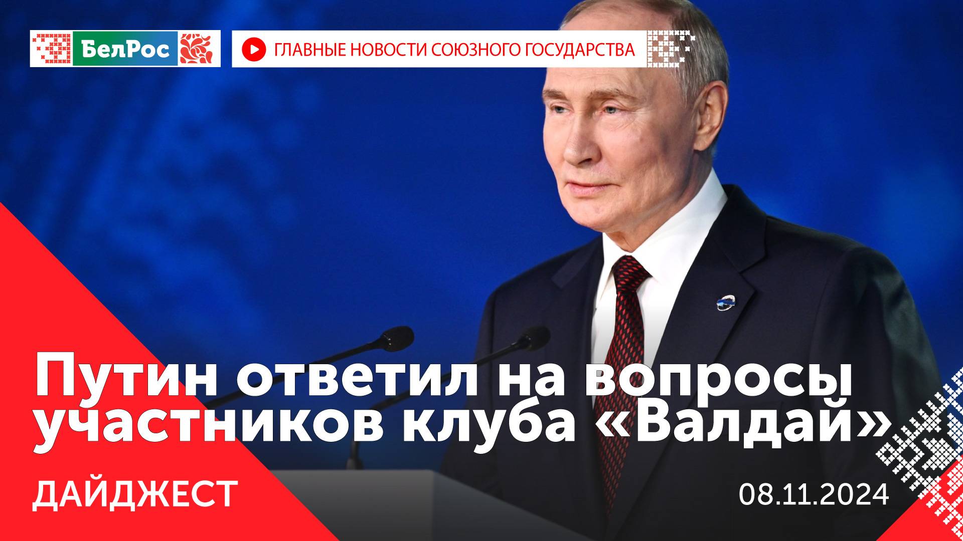 *Главное на 8 ноября 21:00* Закадровый текст озвучивает *ИИ Кирилл* - Владимир Путин выступил на заседании клуба "Валдай". - Лукашенко принял решение о помиловании 31 осужденного за преступления экстремистской направленности. - Лавров о возможности контактов с США: "Разговаривать всегда лучше, чем изолироваться друг от друга". - В Беларуси начали собирать подписи за выдвижение кандидатов Президенты. - Преодоление последствий аварии на Чернобыльской АЭС в центре внимания союзных парламентариев. - На Медиафоруме стран СНГ обсудили вопросы искусственного интеллекта. - Три новые звезды легендам телевидения открыли в галерее у Останкинской башни. - Единственного кота-бизнесмена в России из Перми нашли спустя 5 дней поисков. - Владимир Путин по видеосвязи провёл совещание с постоянными членами Совета Безопасности. - Александр Лукашенко: я делал и буду делать всё для того, чтобы Беларусь была свободной, независимой и мирной. - Пинск встретил "Марафон единства". - Российская армия улучшает свои позиции в ходе спецоперации. Смотрите главные новости Союзного государства на телеканале БелРос. Ссылки на наши соц. сети Сайт: http://belros.tv/ Telegram: https://t.me/belrostv Одноклассники: https://ok.ru/group/55657426976918 ВКонтакте: https://vk.com/belrostv TikTok: https://www.tiktok.com/@belros_tv?_t=... RuTube: https://rutube.ru/channel/23501830/ Яндекс. Дзен: https://zen.yandex.ru/belrostvv Наши подкасты на Яндекс. Музыке: https://music.yandex.ru/album/25615251 #СоюзноеГосударство #главныеновости #новостисегодня