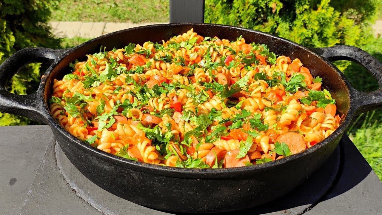 ЛЕГКИЙ УЖИН ЗА 5 МИН. ПОДЛИВА С СОСИСКАМИ И МАКАРОНАМИ | готовим на огне!