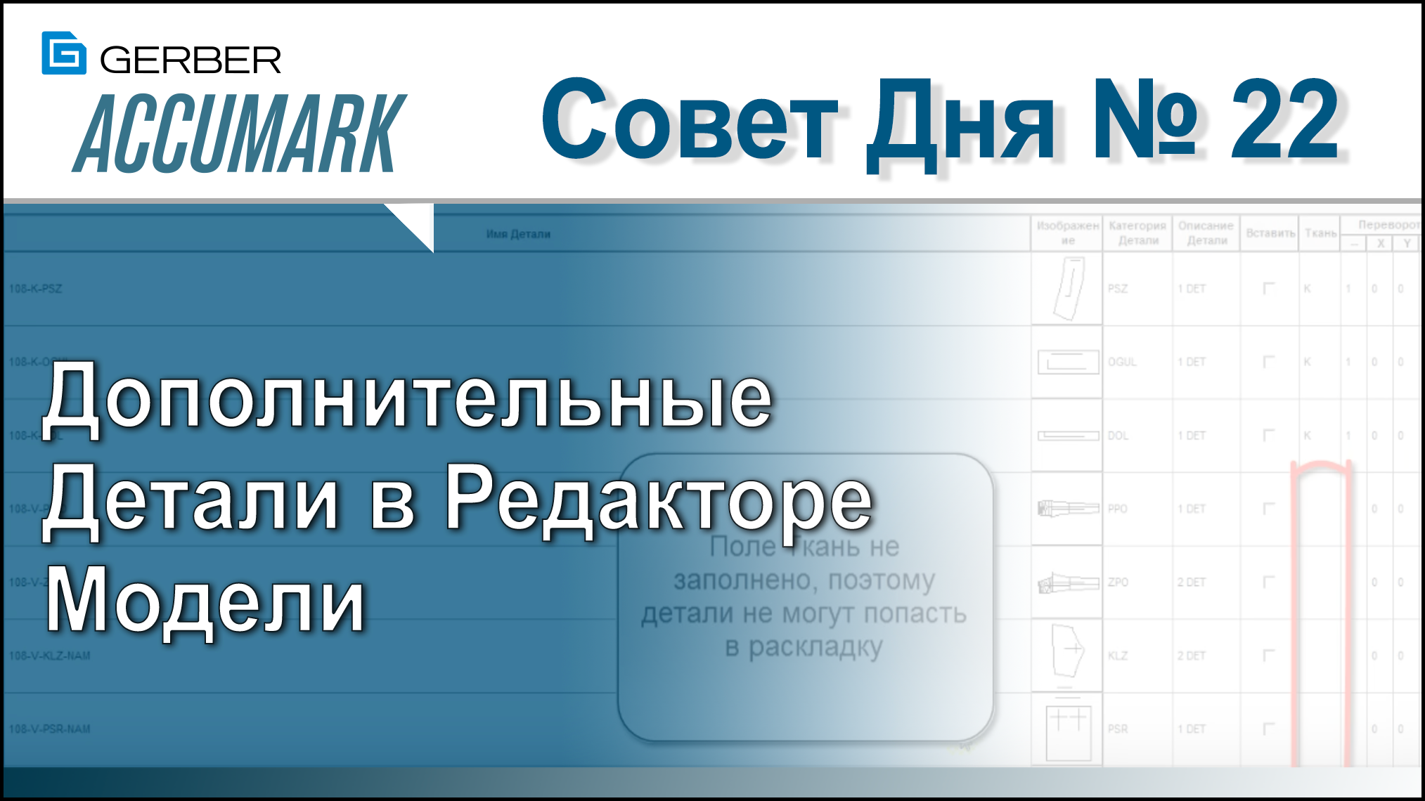 В процессе создания модели часто используются детали, которые не должны попадать в раскладку. Например, базовые детали и намеловочные лекала. Удобно добавлять их в редактор модели без указания типа ткани. Так они в нужный момент будут под рукой. *** #GerberTechnology, #ГерберТехнолоджи, #AccuMark, #АккуМарк, #AccuNest, #АккуНест, #AccuPlan, #АккуПлан, #AccuScan, #АккуСкан *** Сайт: http://www.gerbertechnology.ru, ВКонтакте: https://vk.com/gerbertechnology, Twitter: https://twitter.com/GTSolutionsRu. Instagram: https://www.instagram.com/gerbertechnologyru/ Facebook: https://www.facebook.com/gerbertechnology.ru