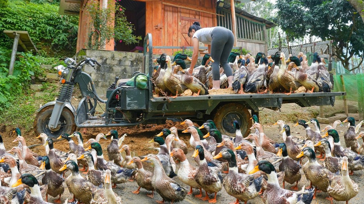 Наловила всех уток на ферме, используя грузовик, везу уток на рынок продавать.