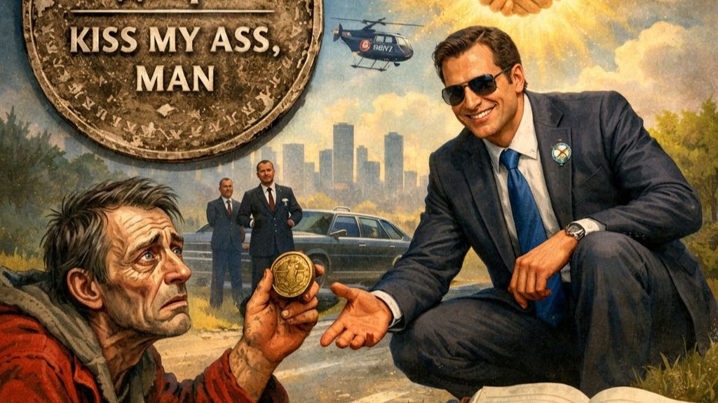 президент мира проходил мимо а я был пьян лежал на обочине бросил монетку неужели мне как же приятно я рад - очень а монетка с секретом в ней золота нету ни меди ни серебра краска облезла и надпись о том что теперь и потом для друга не жалеть добра а еще: "kiss my ass, man" президент мира герой эфира был где-то там и вдруг теперь мой друг в грязь лицом не ударю возьму словарь переведу и пойму что же поцеловать ему