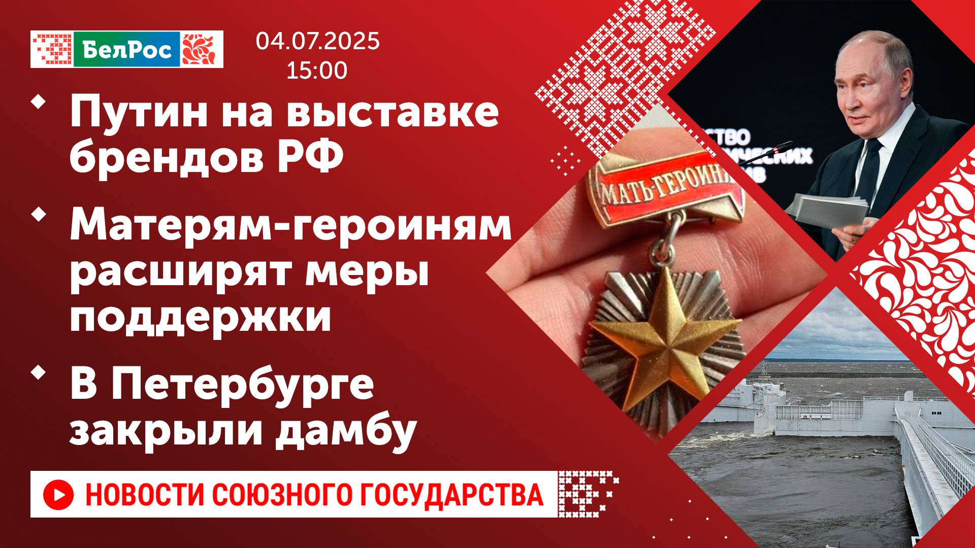 Закадровый текст озвучивает *ИИ Антон* Новости 03.07.2025 на 15:00 - Владимир Путин провёл шестой телефонный разговор с Дональдом Трампом. - Владимир Путин посетил выставку российских брендов. - Бывший мэр Луганска погиб при взрыве в центре города. - В России начнёт действовать ряд мер поддержки женщин, имеющих звание "Мать-героиня". - Аллея Героев была открыта в парке имени Уго Чавеса в Минске. - В Санкт-Петербурге из-за угрозы наводнения перекрыли дамбу в Финском заливе. Смотрите главные новости Союзного государства на телеканале БелРос. Ссылки на наши соц. сети Сайт: http://belros.tv/ Telegram: https://t.me/belrostv Одноклассники: https://ok.ru/group/55657426976918 ВКонтакте: https://vk.com/belrostv TikTok: https://www.tiktok.com/@belros_tv?_t=... RuTube: https://rutube.ru/channel/23501830/ Яндекс. Дзен: https://zen.yandex.ru/belrostvv Наши подкасты на Яндекс. Музыке: https://music.yandex.ru/album/25615251 #главныеновости #новостисегодня #СоюзноеГосударство