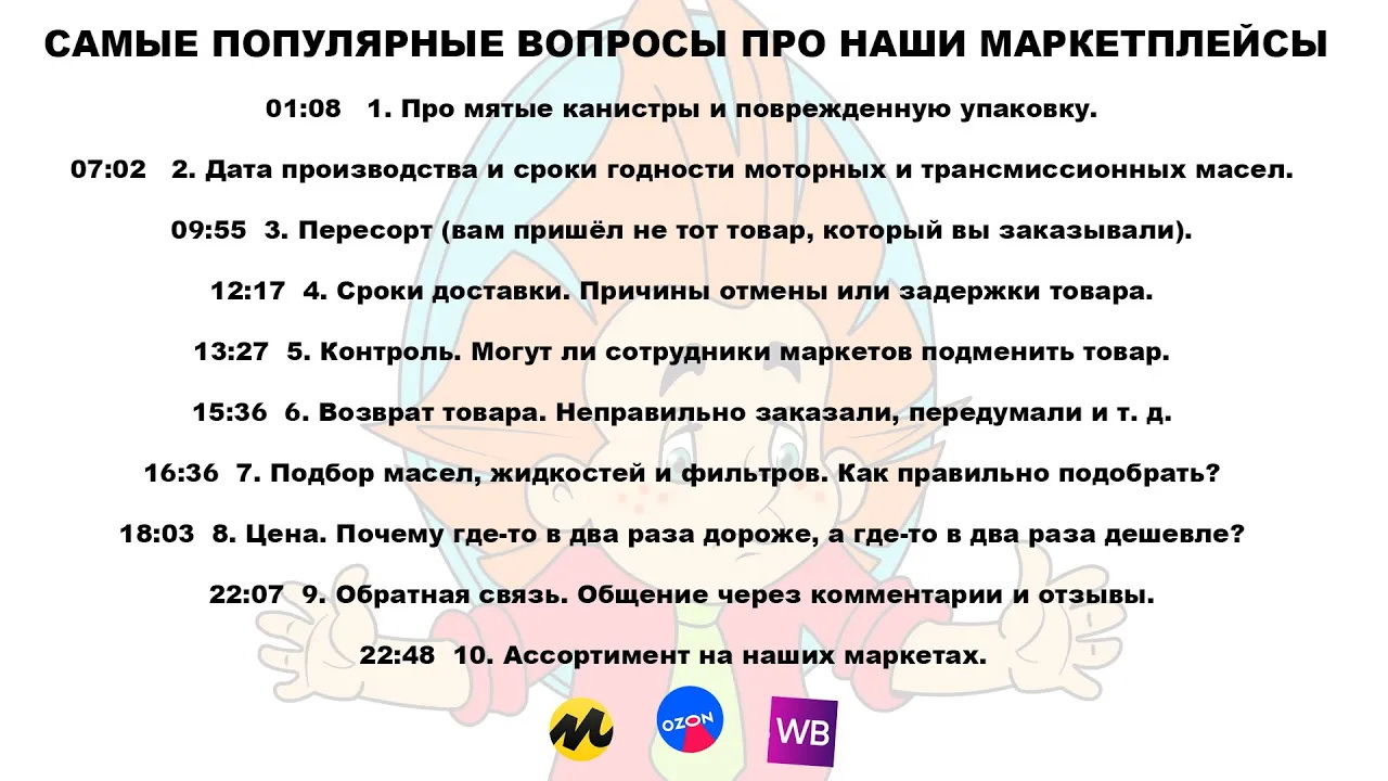 #anton_mygt #ozon #wildberries #yandexmarket #verity #eagle #gulfwestern #biaobang #unitedoil Для навигации по видео нажимайте на временные метки ниже: 01:08 1. Про мятые канистры и поврежденную упаковку. 07:02 2. Дата производства и сроки годности моторных и трансмиссионных масел. 09:55 3. Пересорт (вам пришёл не тот товар, который вы заказывали). 12:17 4. Сроки доставки. Причины отмены или задержки товара. 13:27 5. Контроль. Могут ли сотрудники маркетов подменить товар. 15:36 6. Возврат товара. Неправильно заказали, передумали и т. д. 16:36 7. Подбор масел, жидкостей и фильтров. Как правильно подобрать? 18:03 8. Цена. Почему где-то в два раза дороже, а где-то в два раза дешевле? 22:07 9. Обратная связь. Общение через комментарии и отзывы. 22:48 10. Ассортимент на наших маркетах. Видео по теме: Почему мы не продаём MOBIL, SHELL, CASTROL через OZON и WB? И когда начнем продавать? https://www.youtube.com/watch?v=PVzRApIU5HI ПО НОВОМУ УПАКОВЫВАЕМ КАНИСТРЫ 20Л. WB, OZ, YM. https://youtube.com/shorts/8jOIL1aYylE УПАКОВКА ТОВАРА ДЛЯ WB, OZ, YM https://www.youtube.com/watch?v=Sod7-yk8upI НАШИ КОНТАКТЫ: Звоните 8800-550-5722 пн-пт 9.00-17.00 Учитывайте разницу во времени. Мы находимся в Новосибирске по адресу Николая Островского, 111 к5 319 офис; 3 этаж Дополнительные номера: +79237754997 +79237751551 +79139155112 Обязательно подпишитесь на нас на ДЗЕН - это важно! https://dzen.ru/mygt Вот наш сайт: https://mygt.ru/oil/ ВНИМАНИЕ!!!! На ozon и wildberries представлен ОЧЕНЬ ограниченный выбор наших продуктов. Всё остальное есть у нас на сайте. Отправляем по России ЛЮБОЙ ТК. По вопросам наличия обращайтесь по вышеуказанным номерам. Вот наш официальный магазин на ozon ИП ВОРОНКОВ https://www.ozon.ru/seller/ip-voronkov-829866/products/ Вот наш официальный магазин на wildberries MYGT https://www.wildberries.ru/seller/1163651 Вот наш официальный магазин на yandex market ИП Воронков MYGT https://market.yandex.ru/business--ip-voronkov-mygt/67687783