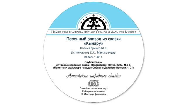 Песенный эпизод из сказки «Кынару», кумандинский диалект, нотный пример № 9. Исполнитель П.С. Максимачева. Запись 1985 г. Опубликовано: Алтайские народные сказки. Новосибирск: Наука, 2002. 455 с. (Памятники фольклора народов Сибири и Дальнего Востока; т. 21).