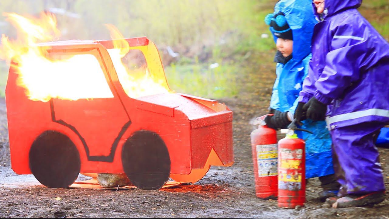 Дети и машина. Дети-пожарные с огнетушителями и игручка машина. МанкитуИгры