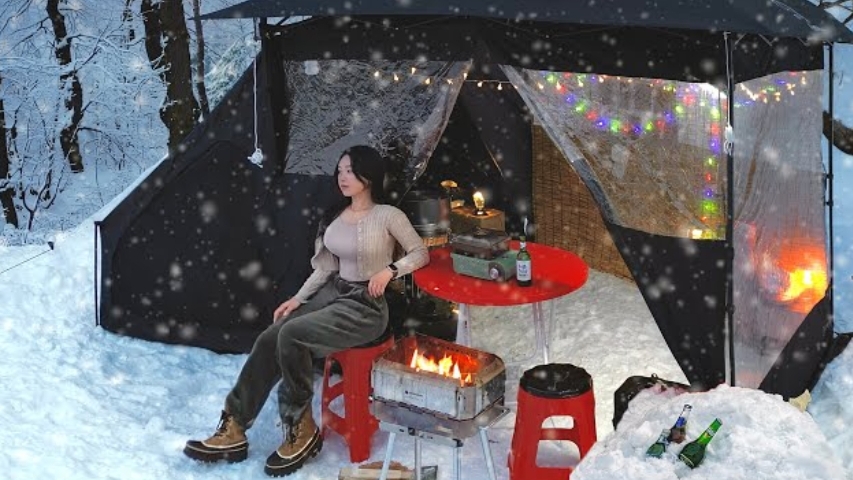 Уютный снежный кемпинг. Превращают тент в ресторанчик уличной еды.
