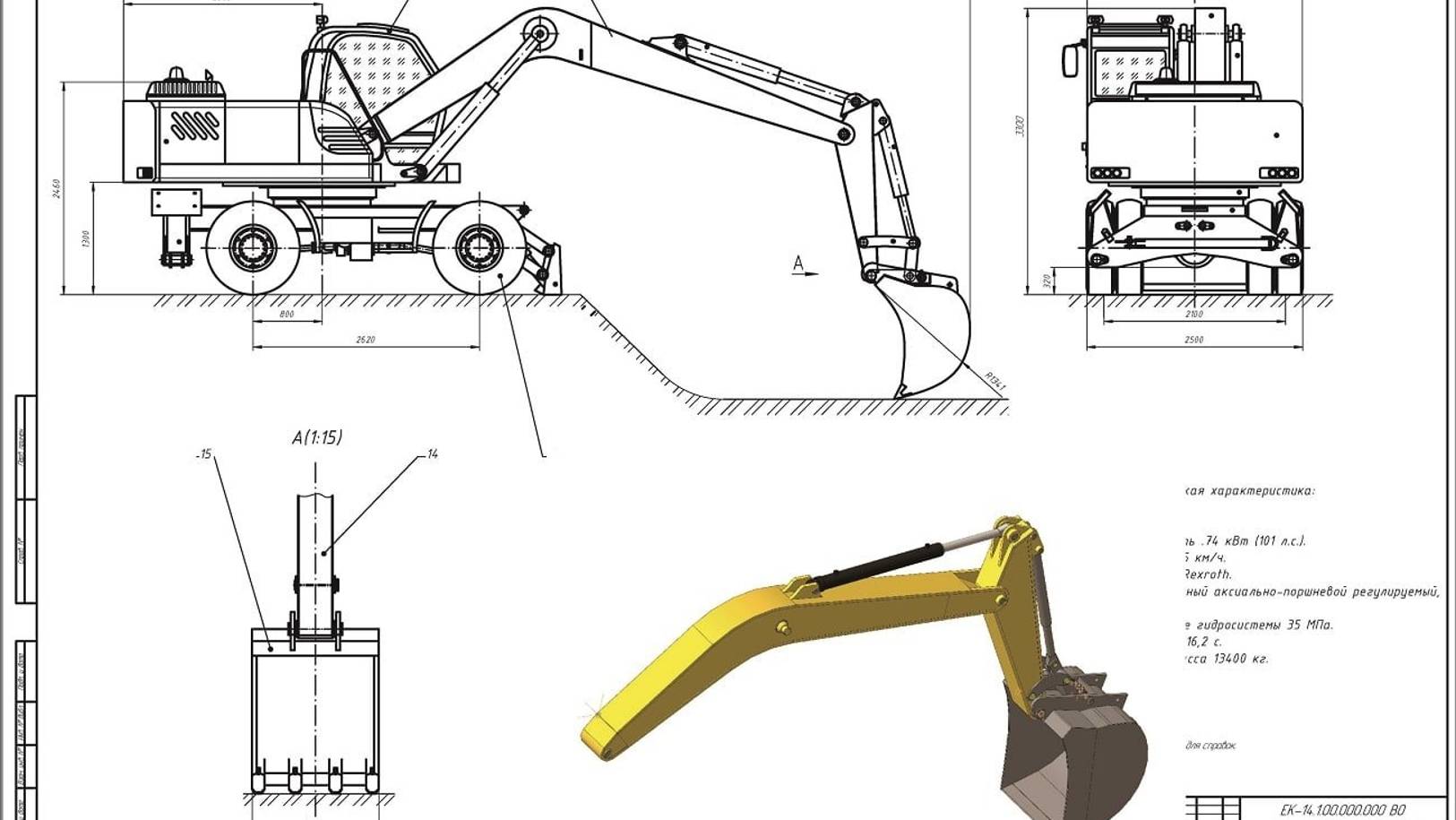 Экскаватор ЕК-14 с устройством квик-каплер чертежи 3d модель расчёты
