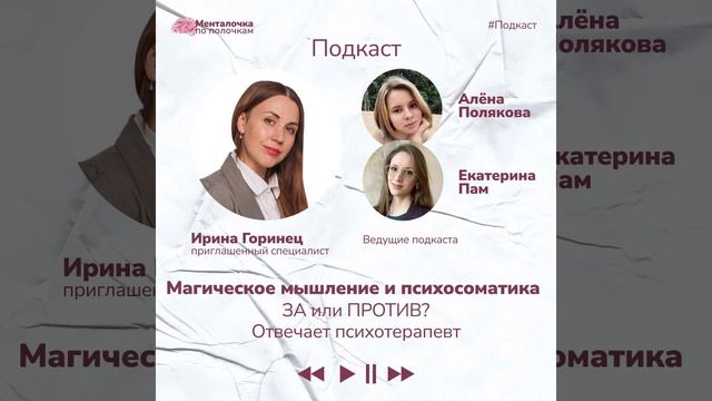 Подписывайтесь на телеграм-канал "Менталочка по полочкам": https://t.me/mentalochka_daily Подкаст о магическом мышлении и психосоматике с психотерапевтом Ириной Горинец. 1️⃣Подробно разобрали проблематику магического мышления и выяснили, что в нём есть не только минусы, но и плюсы, например ощущение опоры. 2️⃣Узнали, что делать, если обнаружили у себя магическое мышление и способы прийти к рациональному. 3️⃣Узнали о том, что психосоматические проявления могут быть как причиной, так и следствием заболевания. 4️⃣Научились отличать доказанную психосоматику от магической. Менталочка по полочкам - это проект двух психологов, который помогает людям узнавать про актуальные темы из мира современной психологии. Здесь уютно и полезно! Мы есть в социальных сетях: ►Телеграм: https://t.me/mentalochka_daily ►ВК: https://vk.com/mentalochka_daily ►Пинтерест: https://ru.pinterest.com/mentalochka_daily/