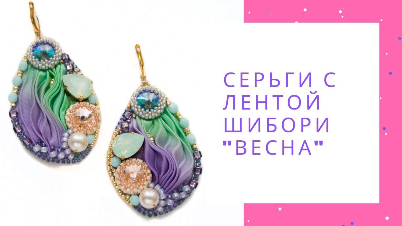 Серьги с лентой шибори "Весна" с кристаллами Сваровски из натуральной кожи NataliaLuzik