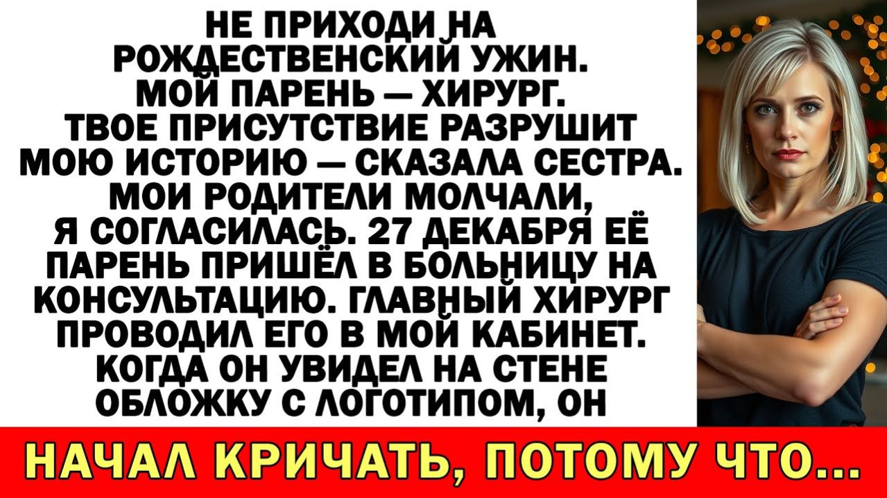 Не приходи на Рождественский ужин. Мой парень — хирург. Твое присутствие разрушит мою историю — сказала сестра. Мои родители молчали, я согласилась. 27 декабря её парень пришёл в больницу на консультацию. Главный хирург проводил его в мой кабинет. Когда он увидел на стене обложку с логотипом, он начал кричать, потому что... Подборка историй из жизни с неожиданной концовкой: Истории из жизни| После развода муж ушёл. А его мама пришла… с багажом и без спроса. |Аудио рассказы - https://rutube.ru/video/4d565ef2db53df57c3a3570f94dd3361/ Свекровь учила меня семейной жизни… Муж поддакивал! Теперь живет у нее на раскладушке! - https://rutube.ru/video/a45ba8d386322b28a3b1acd16bc8c7a8/ Истории из жизни| Свекровь всполошилась |Аудио рассказы |Жизненные истории - https://rutube.ru/video/9b97e109cbd537dde3996440fc992e7c/ Муж решил вписать в мою квартиру свою маму после развода — но его ждала повестка! - https://rutube.ru/video/1a71e51ffddb89c1c7683bc2cdd1b621/ Истории из жизни| Родные решили, что все бесплатно, а я вложила 8500$ - https://rutube.ru/video/4b188c114d0fd7d51a6f1d515caf3a80/ Если любите сильные аудиорассказы и истории из жизни — этот рассказ вас не отпустит до финала. Здесь оживают настоящие семейные истории – драматичные, забавные, порой неожиданные, но всегда жизненные. Свекрови и невестки, тёщи и зятья, братья и сёстры – у каждого своя правда, свои эмоции и свои скандалы. Узнаваемые ситуации, острые конфликты и неожиданные развязки ждут тебя в каждом новом видео! Подпишитесь и напишите, как бы вы поступили на месте главных героев. Жизнь пишется без сценария, но каждая история оставляет след... #аудиорассказ #историяизжизни #жизненныеистории #семейнаядрама #предательство Аудиорассказ, аудиорассказы, история из жизни, истории из жизни, жизненная история, жизненные истории, семейная драма, про свекровь, про измену, про предательство, сильная история, рассказ до слёз, с неожиданной развязкой