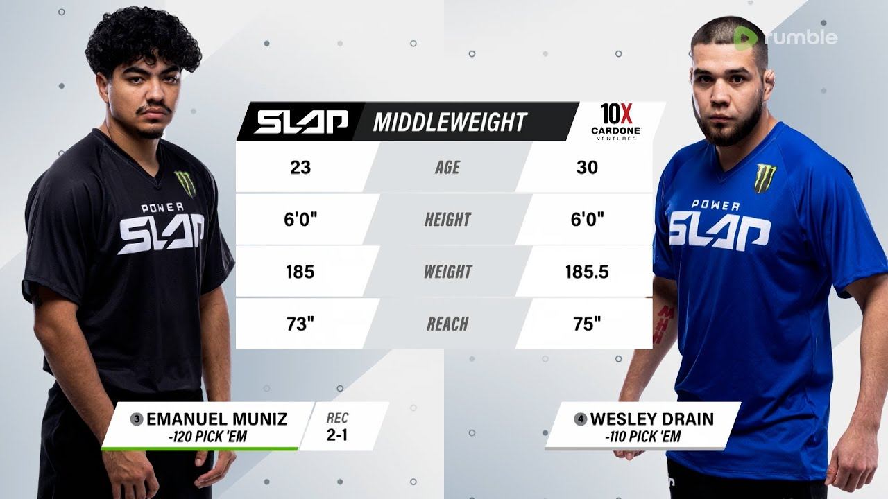Don't miss Power Slap 2, May 24, on RUMBLE https://rumble.com/powerslap Relive Power Slap 1: Emanuel Muniz vs Wesley Drain before Power Slap 2 airs May 24 exclusively on Rumble! Watch the Power Slap 2 live & free on RUMBLE http://bit.ly/3J7WHCr ‼️ Rumble is free on desktop, mobile and web at www.rumble.com, iOS, Android, Roku, AppleTV, FireTV, Android TV and LG TV. Live results: http://bit.ly/3FjKSIq Subscribe to get all the latest UFC content: https://ufc.ac/3u8FIJp Experience UFC live with UFC FIGHT PASS, the digital subscription service of the UFC. Visit https://ufcfightpass.com/ To order UFC Pay-Per-Views on ESPN+, visit https://ufc.ac/3NKBvmx (U.S. only) To order UFC Pay-Per-Views, visit http://welcome.ufcfightpass.com/#PPV (Non U.S.) Shop official UFC Gear, visit https://ufcstore.com Shop official UFC Memorabilia, visit https://ufccollectibles.com Shop official UFC VIP Live Event Experiences, visit https://ufc.ac/3Oz2gLH Connect with UFC online and on Social: Website: http://www.ufc.com Twitter: http://www.twitter.com/ufc Facebook: http://www.facebook.com/ufc Instagram: http://www.instagram.com/ufc Snapchat: UFC Twitch: https://www.twitch.tv/ufc Connect with UFC FIGHT PASS on Social: Twitter: http://www.twitter.com/ufcfightpass Facebook: http://www.facebook.com/ufcfightpass Instagram: http://www.instagram.com/ufcfightpass #UFC #PowerSlap #PowerSlap2 #DanaWhite