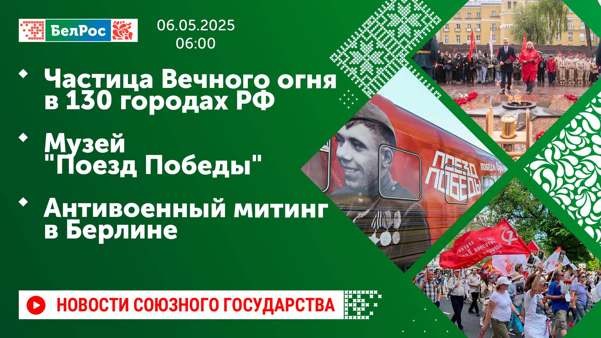 Закадровый текст озвучивает *ИИ Антон* Новости 06.05.2025 на 06:00 - Частицы Вечного огня отправили в регионы России и 21 страну. - Бойцы группировки "Центр" восстановили памятник в ДНР к 80-летию Победы. - Артисты фронтовой творческой бригады посетили детский дом в ДНР. - Жители Подмосковья посетили передвижной музей "Поезд Победы". - Выставка трофейной техники НАТО открылась в Екатеринбурге. - 80 пар приняли участие в акции "Вальс Победы" в ДНР. - Антивоенный митинг, приуроченный к 80-летию Великой Победы, прошёл в Берлине. Смотрите главные новости Союзного государства на телеканале БелРос. Ссылки на наши соц. сети Сайт: http://belros.tv/ Telegram: https://t.me/belrostv Одноклассники: https://ok.ru/group/55657426976918 ВКонтакте: https://vk.com/belrostv TikTok: https://www.tiktok.com/@belros_tv?_t=... RuTube: https://rutube.ru/channel/23501830/ Яндекс. Дзен: https://zen.yandex.ru/belrostvv Наши подкасты на Яндекс. Музыке: https://music.yandex.ru/album/25615251 #главныеновости #новостисегодня #СоюзноеГосударство