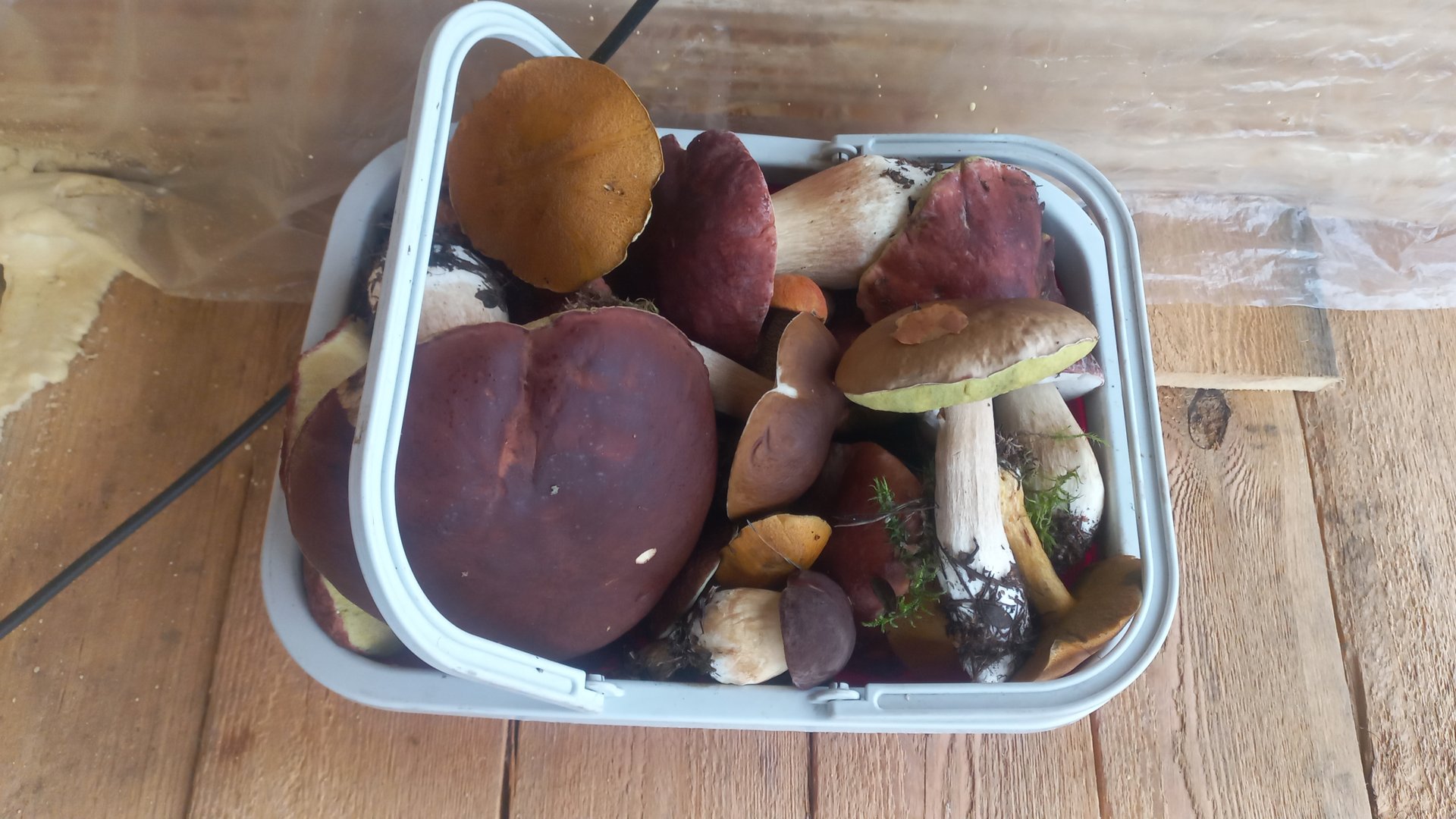 ЛЕС , Зашла обнять деревья , вышка с корзиной БОРОВЫХ ГРИБОВ