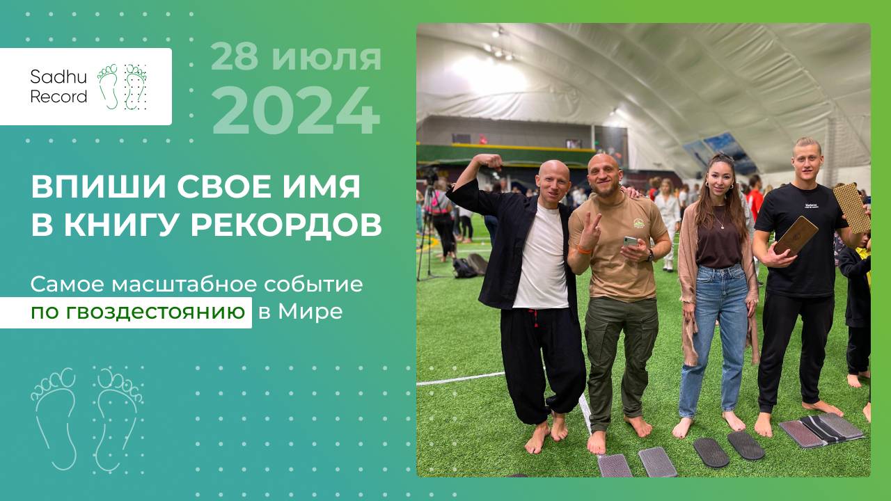 Рекорд РОССИИ и МИРА по массовому гвоздестоянию на 1500 человек состоится 28 июля 2024 года в 14.00 в Музее-заповеднике «Коломенское»! Это будет самое масштабное и уникальное в своём роде событие, которое положит начало НОВОЙ ВОЛНЫ развития гвоздепрактик и других дыхательных, медитативных и телесно-ориентированных практик в России и в Мире. В 12.30 всем быть уже на площадке. В 13.50 начинаем хороводить. В 14.00 запускаем рекорд. Стань частью истории! Впиши своё имя в книгу рекордов России и Мира! Регистрируйся на сайте https://sadhu-record.ru и участвуй в самом масштабном рекорде-практике-шоу! ПРОМОКОД на скидку: BLAGO Тебя ждёт: Самый масштабный рекорд-практика-шоу по массовому гвоздестоянию, который когда-либо проводился. Знакомство с лучшими мастерами и школами России и Мира в одном месте. Официальный сертификат участника рекорда, ты станешь частью истории, а событие изменит индустрию гвоздепрактики. Море драйва и активностей в рамках уникального фитнес-фестиваля под открытым небом DDX Fitness FEST, где соберётся более 20000 человек (27-28 июля 2024 года). + выступление звезд (Диана Арбенина, DJ Smash, Artik&Asti и другие). + огромная зона духовных и телесно-эмоциональных практик. + фитнесс фестиваль, турниры и призы. + трансляция на тв. В этот день соберутся вместе все лидеры этого дела: Благов Александр, Смагажевский Алексей, Александр Вааль, Паак Дживан, Антон Чаплыгин, Дмитрий Лапшинов, Дмитрий Хара, а также мастера, основатели школ гвоздепрактиков со всей России, Мира и производители Досок Садху. Причины участвовать: 1. Для гвоздепрактиков. Вас будут ждать непередаваемые эмоции! Такой подачи, сочетающей в себе методологию глубокого погружения в практику, и наполнения в виде цифрового, музыкального и танцевального волшебства, которое будет твориться на сцене, вы никогда ранее не видели. Это совершенно новый опыт, который откроет новые грани ваших возможностей. А еще команда Sadhu Record уверена, что часть из вас захочет углубиться в тонкости этого направления и возможно стать мастером или инструктором гвоздепрактики! 2. Для мастеров, инструкторов, школ и производителей. На событии будет объявлено о создании Ассоциации Гвоздепрактиков и профессионалов в сфере физического, эмоционального и ментального совершенствования человека, которая начнет формировать официальный реестр мастеров, инструкторов, школ и производителей, отвечающих новым стандартам отрасли, поэтому участие в рекорде мастеру, инструктору, представителю школы и представителю производителя, а также получение сертификата участника или партнера рекорда — это архиважно! Это будет первый шаг, чтобы попасть в реестр! Индустрия фитнеса, а это миллионы людей, не знакомых с практикой, будут сотрудничать только с теми, кто есть в реестре. 3. Для начинающих. Прекрасный повод познакомиться с практикой, получить мощный заряд и энергию, прожить незабываемые состояния и своими глазами увидеть, как гвоздепрактика захватывает всё больше и больше людей, раскрывая их потенциал и возможности Стань частью истории! Впиши своё имя в книгу рекордов России и Мира! Регистрируйся на сайте https://sadhu-record.ru и участвуй в самом масштабном рекорде-практике-шоу! ПРОМОКОД на скидку: BLAGO Официальная группа мероприятия: https://t.me/Sadhu_Record_chat Ссылка на группу челленджа: https://t.me/+_OmIw2GqOg43Nzcy instagram @sadhu_record / sadhu_record #садхурекорд #челленджсадхурекорд