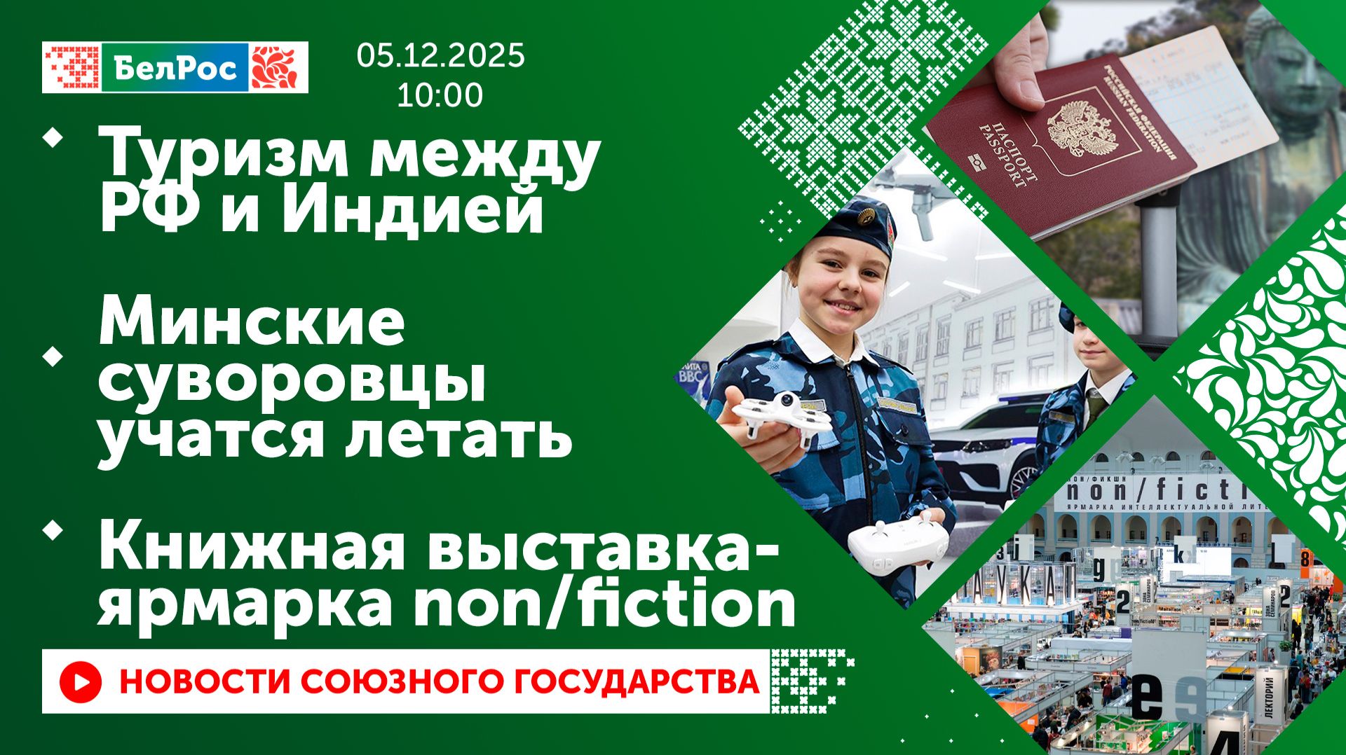 Закадровый текст озвучивает *ИИ Антон* Новости 05.12.2025 на 10:00 - Максим Орешник: Россия продлила срок действия электронных виз для индийских граждан. - В учебном центре группировки войск "Север" готовят специалистов войск беспилотных систем. - Минские суворовцы осваивают управление беспилотниками. - Фестиваль "Таленты Беларусi - будучыня краiны" завершился в Минске ярким гала-концертом. - В Москве открылась Международная книжная выставка-ярмарка non/fiction. Смотрите главные новости Союзного государства на телеканале БелРос. Ссылки на наши соц. сети Сайт: http://belros.tv/ Telegram: https://t.me/belrostv Одноклассники: https://ok.ru/group/55657426976918 ВКонтакте: https://vk.com/belrostv TikTok: https://www.tiktok.com/@belros_tv?_t=... RuTube: https://rutube.ru/channel/23501830/ Яндекс. Дзен: https://zen.yandex.ru/belrostvv Наши подкасты на Яндекс. Музыке: https://music.yandex.ru/album/25615251 #главныеновости #новостисегодня #СоюзноеГосударство
