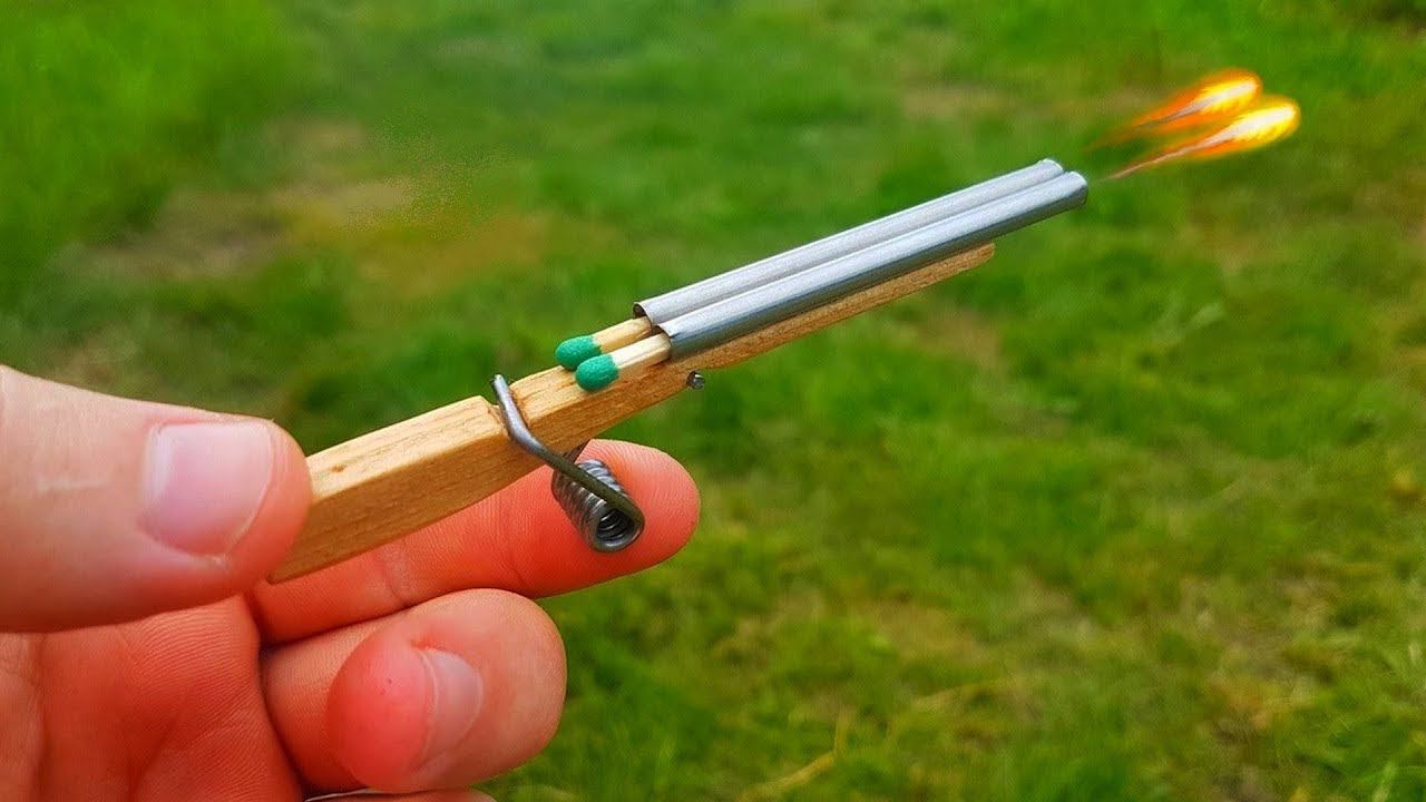 We make a mini double-barreled shotgun from matches and clothespins