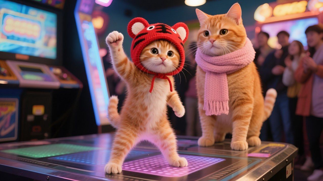 Аркадный квест котёнка в тигровой шапочке: наставник по крану-машинке + стул-кольцо + сплит в танце