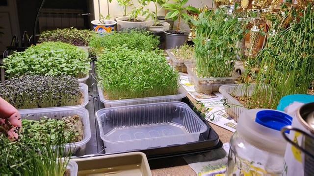 Поливаю микрозелень и рассаду водой с добавлением 1 капли йода. Под лампой: Чечевица Горошек первый урожай Горошек второй урожай Красная капуста Укроп, бэйби лист Кресс-салат, бэйби лист Петрушка, бэйби лист Японская капуста Морковь Мизуна красная Лук Щавель Рассада: Томаты Люпины