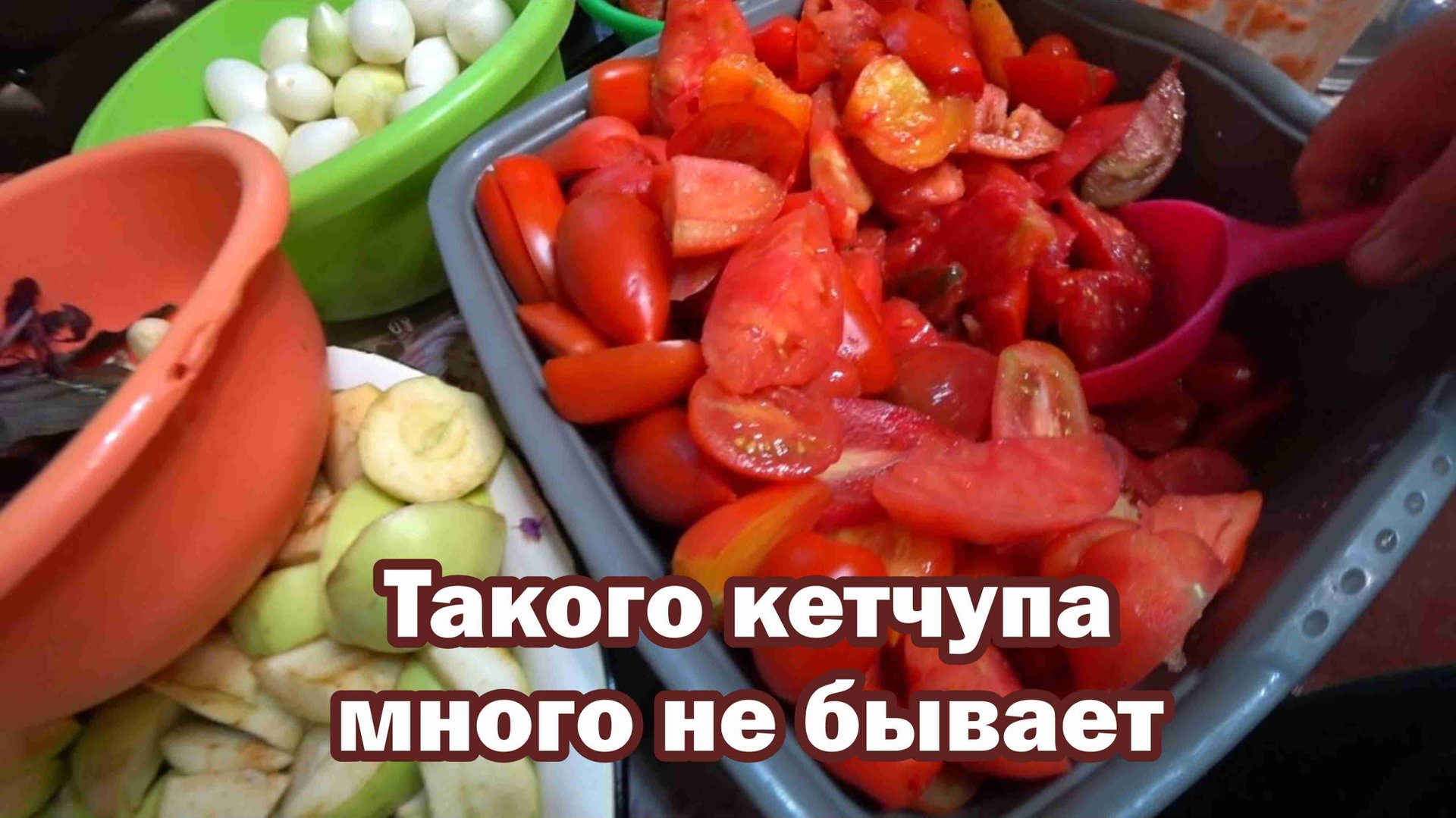 Рецепт: - 12 кг красных помидоров - 2 кг кислых яблок - 3 кг лука - 10 средних головок чеснока - 4 веточки фиолетового базилика - 2 кг красного болгарского перца - 10 ст. л. соли - 800 г сахара - 0,5 ст. л. душистого перца - 0,5 ст. л. перца горошком - 0,5 ст. л. гвохдики - 10 лавровых листьев - 300-400 мл 9% уксуса - 1-2 ст. л. пектина Подписывайтесь на телеграм канал "Дела Хозяйские" https://t.me/delahozblogkanal