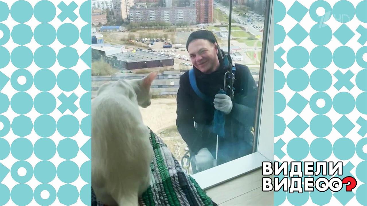Кот Дариус и промышленный альпинист Игорь общаются через окно на 24 этаже.