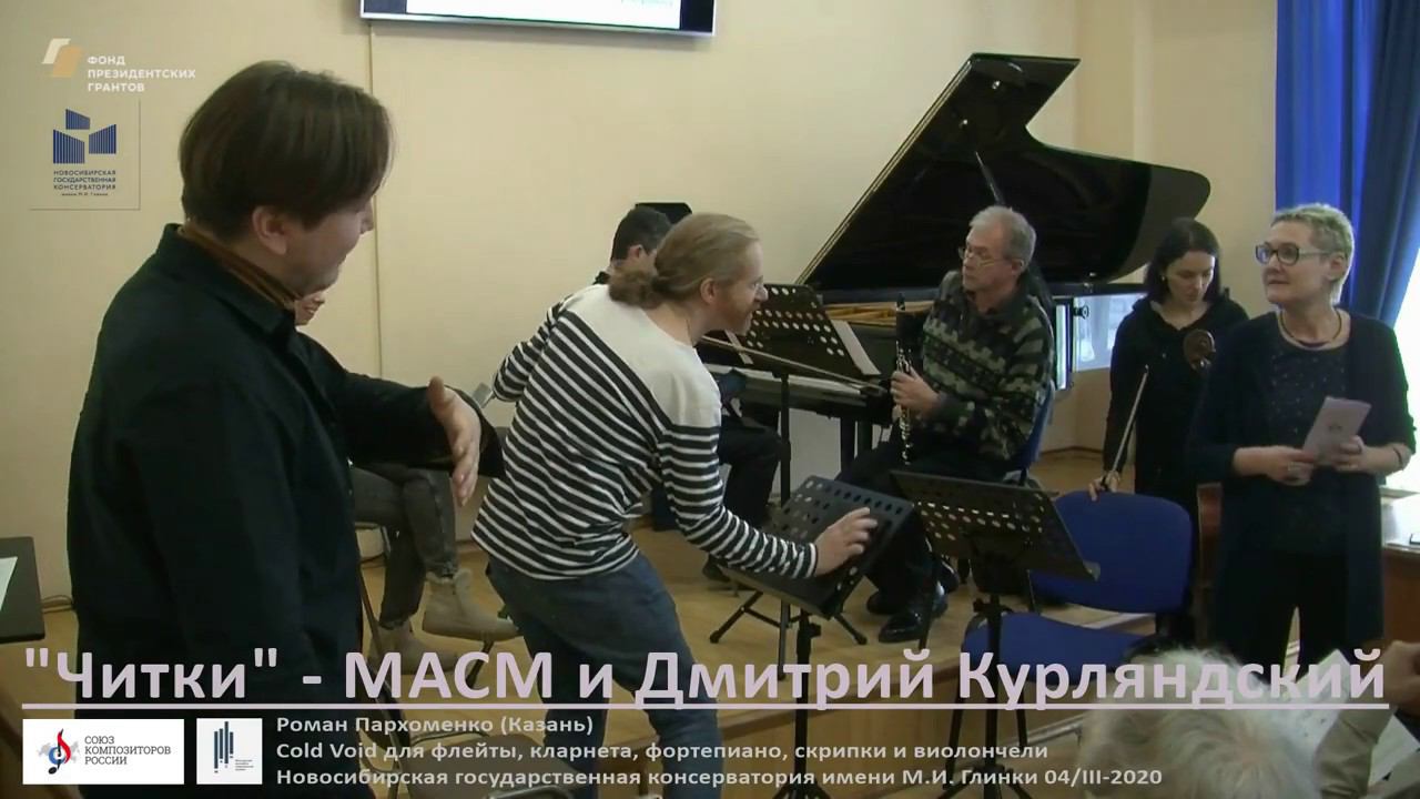 С 3 по 06 марта 2020 года в Новосибирской консерватории прошли «Композиторские читки» – четырехдневная композиторская лаборатория, в ходе которой молодые авторы впервые слышат свои партитуры в «живом» исполнении музыкантов Московского ансамбля осовремененной музыки (МАСМ), а также получают советы от опытных наставников-кураторов. 4 марта 2020, второй день Читок Роман Пархоменко. Cold Void для флейты, кларнета, фортепиано, скрипки и виолончели Куратор Дмитрий Курляндский Исполнители: Мария Алиханова (флейта), Олег Танцов (кларнет), Роман Минц (скрипка), Ольга Дёмина (виолончель), Михаил Дубов (фортепиано) 02:55 Исполнение произведения 08:42 Роман Минц, Мария Алиханова - разбор партитуры 14:52 Дмитрий Курляндский, Михаил Дубов - разбор партитуры Проект поддержан Фондом Президентских грантов