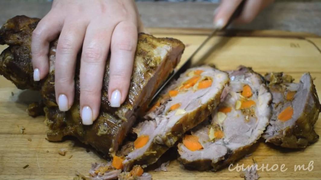 Буженина (Простой рецепт!!!) | Roasted Meat Recipe Буженина - это блюдо всегда украсит любой стол, очень вкусный рецепт. Буженина - это очень аппетитная, вкусная мясная закуска, шпигованная чесноком, морковью, ароматными пряностями и запеченная крупным куском. Ароматное и очень сочное мясо можно подать к столу и в горячем виде. Оно бесподобно вкусное и мягкое, его можно есть губами - вот, почему многие предпочитаю съесть буженину именно в горячем виде. Подают готовую буженину в охлажденном виде, нарезав мясо поперек волокон. Исключительно вкусно с хреном, горчицей. Именно в холодном виде можно почувствовать весь вкус и аромат этого шикарного блюда! Готовить буженину несложно, но на это требуется время. Сочная, ароматная, очень аппетитная - она прекрасно подходит в качестве мясной нарезки не только для праздничного застолья, но и для приготовления утренних бутербродов, салатов, в качестве перекуса и как нельзя лучше заменяет магазинную колбасу. Готовьте с любовью и удовольствием! Ешьте и наслаждайтесь, приятного аппетита! Ингредиенты: мясо-2кг. (у меня свиная шея) морковь-2шт. очищенный чеснок-50гр. соль-1,5ч.л. молотый кориандр-1ч.л. сладкая паприка-1ч.л. черный перец-1/2ч.л. горчица-2ч.л. растительное масло-2ст.л. лавровый лист-4шт. в духовку t150C на 3 часа #сытноетв #буженина #рецепты #рецепт #кулинария #вкуснаябуженина #какприготовитьбуженину #буженина #буженинавдуховке #какзапечьбуженину #буженинарецепт #буженинаизсвинины #сочнаябуженина #мягкаябуженина