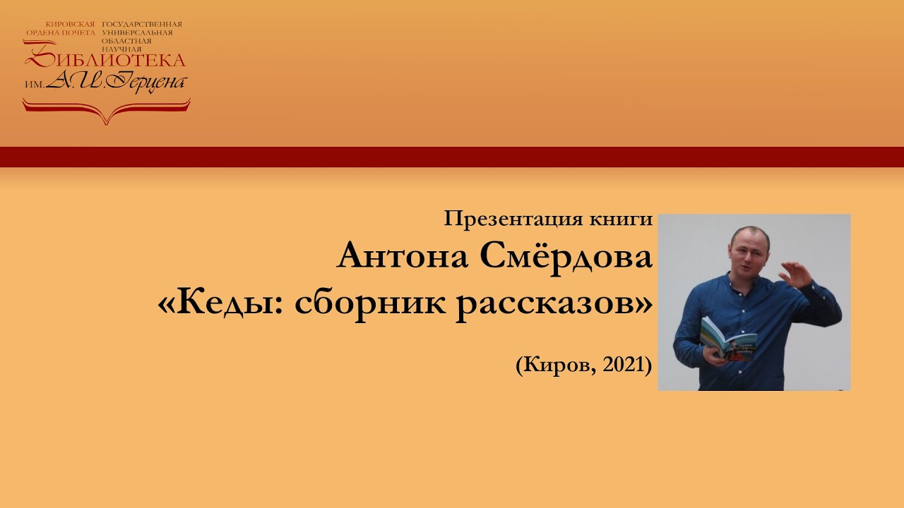 26 января в литературной гостиной библиотеки в особо душевной обстановке прошла презентация книги Антона Смёрдова «Кеды: сборник рассказов» (Киров, 2021). (Ротонда-персона. Приложение к литературному журналу «Ротонда»)». В начале встречи поэт и прозаик, член литературного клуба «Молодость» Антон Смёрдов с присущим ему чувством юмора рассказал о творческом замысле, о работе над изданием: «Мы очень долго шли к этой книге. Хорошая она или плохая – судить не мне. Рассказы писались много лет. А сама задумка возникла 4 года назад. Книга должна была называться „Четыре времени года“. Все рассказы привязаны к конкретным местам – они связаны с Кировом. И в каждом есть надежда на жизнь, свет, любовь». Поздравить Антона Смёрдова с выходом книги пришли коллеги, друзья, читатели. (материал от 7 февр. 2022 г.)