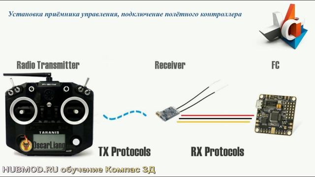 HUBMOD.RU Бесплатные Демо-Уроки — посмотрите и убедитесь: Всё просто и понятно! 00:00:08 — После проведения испытания можно переходить к следующему, седьмому этапу сборки — установке приемника управления. Обычные приемники подключаются тремя проводами — это питание плюс 5 вольт или плюс 3 вольта, которая соединяется с платой распределения питания земля и сигнал. 00:00:40 — Сигнал на приемнике подписан как TX, потому что из него передаются данные. Он соединяется с RX, полетного контроллера. В общепринятой терминологии для FPV и RC, пульта дистанционного управления, у каждого последовательного порта есть два контакта. Это TX для передачи и RX для приема. При этом TX на периферийном устройстве всегда подключается к RX на полетном контроллере и наоборот. 00:01:02 — На слайде вы можете ознакомиться с примером установки приемника на FPV-дрон, здесь красный провод это питание, черная земля, белый это сигнал. Также от приемника отходят один или два антенных провода. Их расположение очень важно для обеспечения хорошего сигнала, а также для того, чтобы дрон не потерял сигнал и не упал. Я предпочитаю устанавливать антенны либо на лучах рамы, либо прямо сзади. Самый последний шаг на этом этапе это крепление приемника. Это можно сделать в любое время, однако некоторые приемники имеют специальную кнопку привязки, доступ к которой впоследствии может быть затруднен. 00:01:36 — Кнопка привязки предназначена для программного завершения привязки приемника к передатчику. После привязки приемник будет игнорировать команду других датчиков. Различные передатчики имеют разные методы привязки и все они обычно предполагают включение питания при нажатой кнопке и переход самого передатчика в режим привязки, поэтому я рекомендую предварительно сделать привязку. 00:01:56 — Обычно привязка выполняется следующим образом. Приёмник подключается к полётному контроллеру с помощью коннектора. Проверяется отсутствие в цепи питания короткого замыкания.