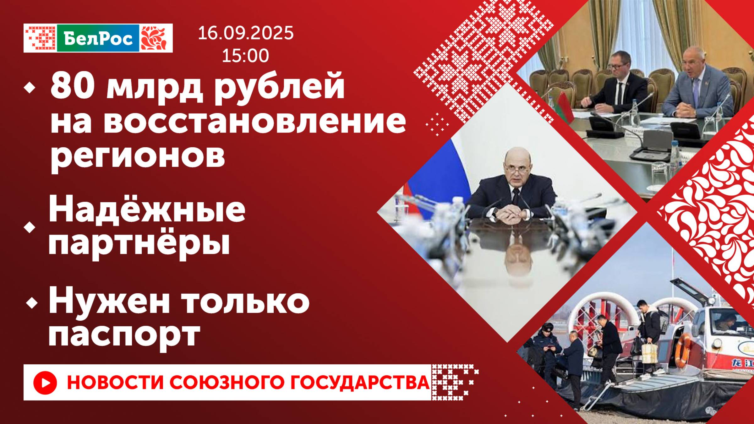 Закадровый текст озвучивает *ИИ Антон* Новости 16.09.2025 на 15:00 - Правительство РФ направит 80 млрд рублей на восстановление Курской, Белгородской и Брянской областей - Делегация Пензенской области посетила Гродно - В Беларуси студентов учат управлять современными дронами - Первые туристы из РФ прилетели в китайский Хэйхэ после отмены визового режима Смотрите главные новости Союзного государства на телеканале БелРос. Ссылки на наши соц. сети Сайт: http://belros.tv/ Telegram: https://t.me/belrostv Одноклассники: https://ok.ru/group/55657426976918 ВКонтакте: https://vk.com/belrostv TikTok: https://www.tiktok.com/@belros_tv?_t=... RuTube: https://rutube.ru/channel/23501830/ Яндекс. Дзен: https://zen.yandex.ru/belrostvv Наши подкасты на Яндекс. Музыке: https://music.yandex.ru/album/25615251 #главныеновости #новостисегодня #СоюзноеГосударство