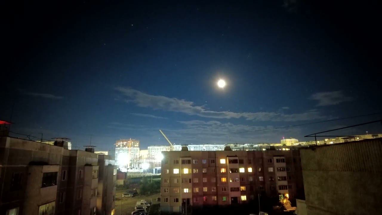 2022 год, покадровая съёмка #таймлапс #timelapse #магадан #нагаево 0:00 начало 0:10 видно как работает кран — строят мост от 2-й очереди "Маяка" к пирсу 0:27 разгораются фонари в парке "Маяк" 0:37 разгорается уличное освещение и туча начинает затягивать небо над бухтой 0:50 видно как из тучи над выходом из бухты идёт дождь... 1:35 пролетел дрон (быстрее секунды) 1:50 погасли последние всполохи зорьки, их заменили окна горожан, уличные фонари, огни порта... и звёзды 2:46 переходим на другу сторону и смотрим на Луну и звёзды, которые изредка закрываются летящими облаками 4:17 Луна ушла из кадра...