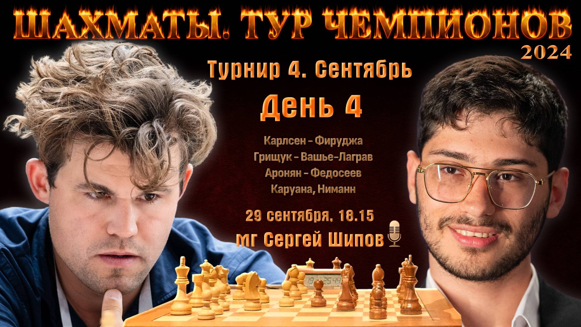 Карлсен - Фирузджа! Грищук, Федосеев 🏆 Тур чемпионов. День 4 ⏰ 29 сентября, 18.15 🎤 Сергей Шипов ♕