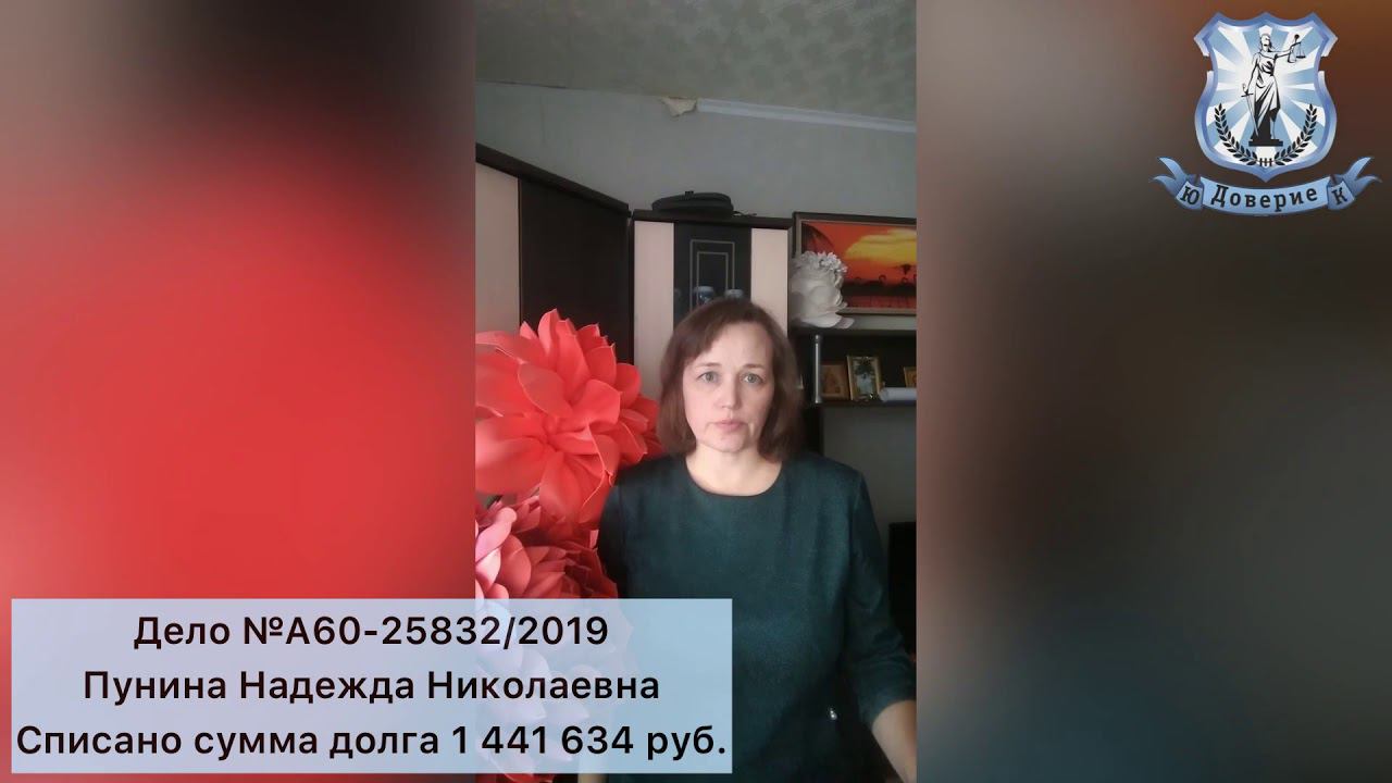 Банкротство физических лиц ЮК "Доверие" Списана сумма долга 1 441 634 руб. Видео отзыв Пунина Н.Н.