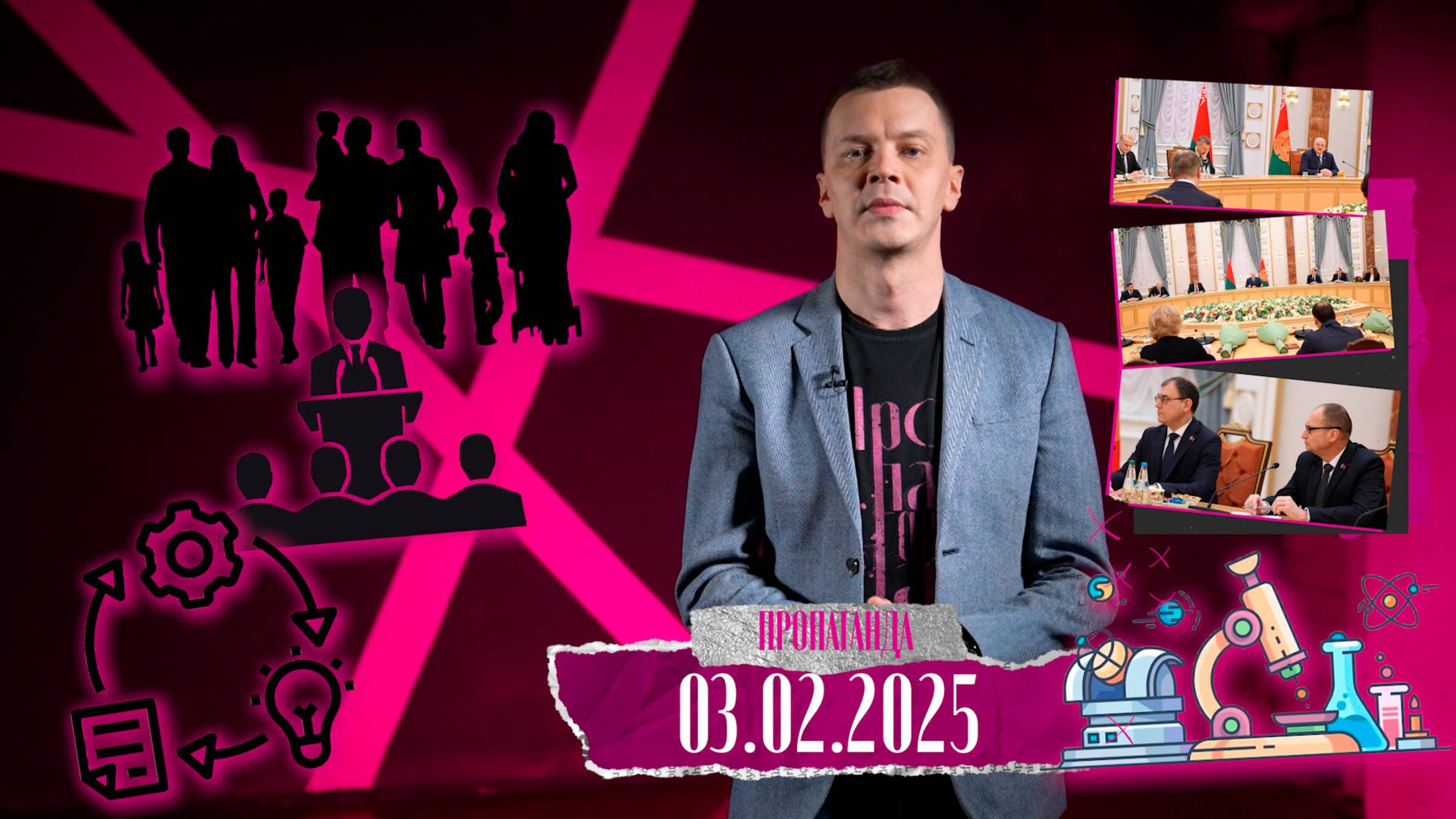 В новом выпуске авторского проекта политического обозревателя ОНТ Игоря Тура "Пропаганда": (03.02.2025): – о ключевых темах, касающихся предстоящих выборов в 2025 году, – в чем важность спокойного волеизъявления, – почему практические решения, принимаемые Президентом после выборов, важнее громких заявлений, – вопросы экономики и социальных мер, – указы Президента, направленные на поддержку экономики, – о программах кредитования и предоставление арендного жилья, – во вторник Президент встречался с делегацией Панафриканского парламента, – почему Лукашенко считается диктатором или авторитарным лидером, – Президент принял решение на охрану государственной границы, – некоторые люди склонны верить даже не в заведомую ложь, а в заведомую и абсолютную чушь, – о важности научных разработок для дальнейшего развития страны, – лень как часть славянской культуры, – почему важно активное участие граждан в работе на благо страны, – о важности активной гражданской позиции.